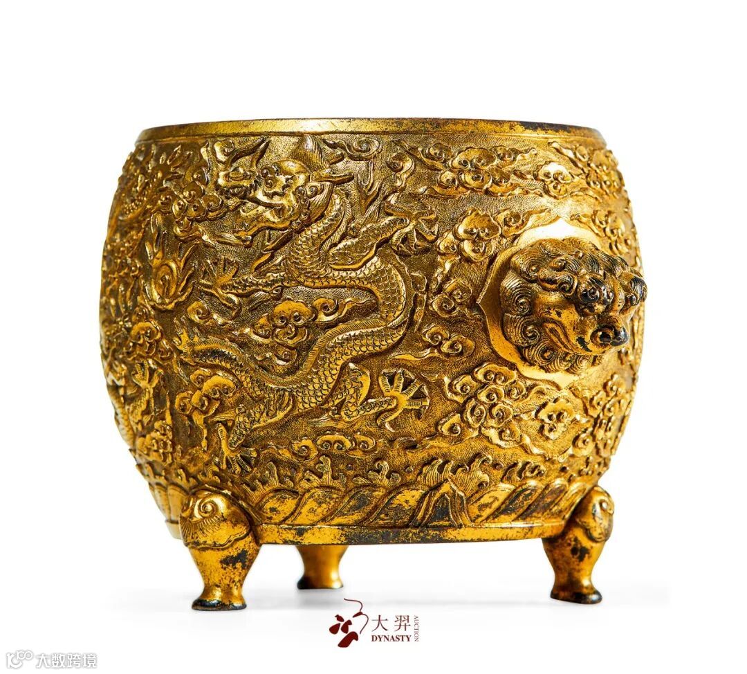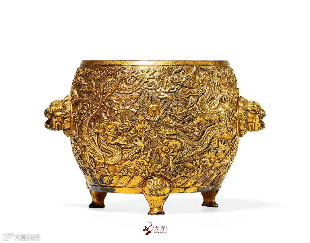 铜鎏金双龙戏珠兽耳三足炉 高:9 cm. 来源:欧洲藏家旧藏
