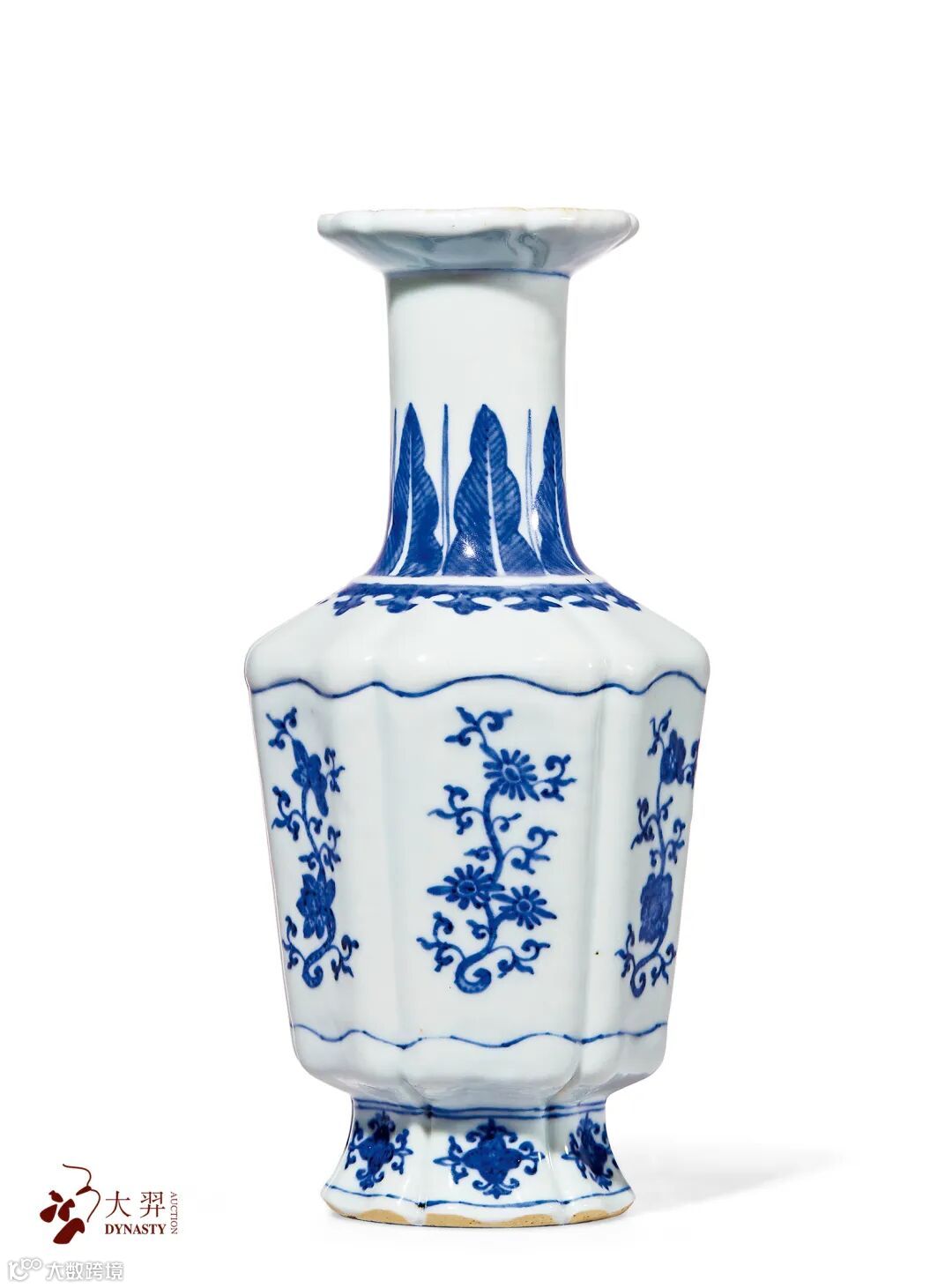 瓶呈六方形,器形端正大气,恢宏威严。折肩处之如意纹、将瓶壁纹饰分成两部分,上颈部绘蕉叶纹,下腹部绘折枝花卉,纹饰上下呼应。整器釉质肥厚润泽,青花苍翠欲滴。方器烧制难度大于圆器,本瓶为六方形,因此烧造难度更甚,故而十分难得,保存至今更是极为不易。
