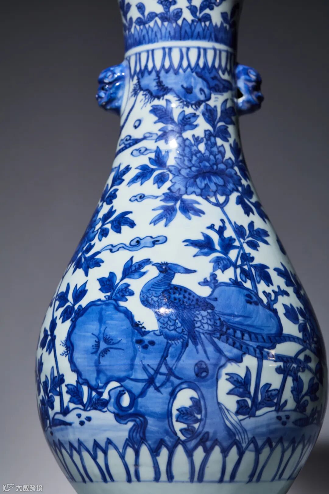 LOT129 明万历 青花雉鸡牡丹图双兽耳瓶(细节图)