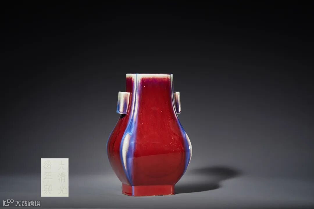 窑变釉是一种以铜红釉为主,并添加多种金属元素烧制而成的高温釉,为唐英督理景德镇御窑厂时仿钧窑釉色所繁衍出的一个创新品种。借用唐诗来赞美窑变釉恰如其分,“高山云雾霞一朵,烟光空中星满天,峡峪飞瀑兔丝缕,夕阳紫翠忽成岚”。贯耳瓶是窑变釉器物的典型造型之一,自乾隆至清代晚期均有烧造。