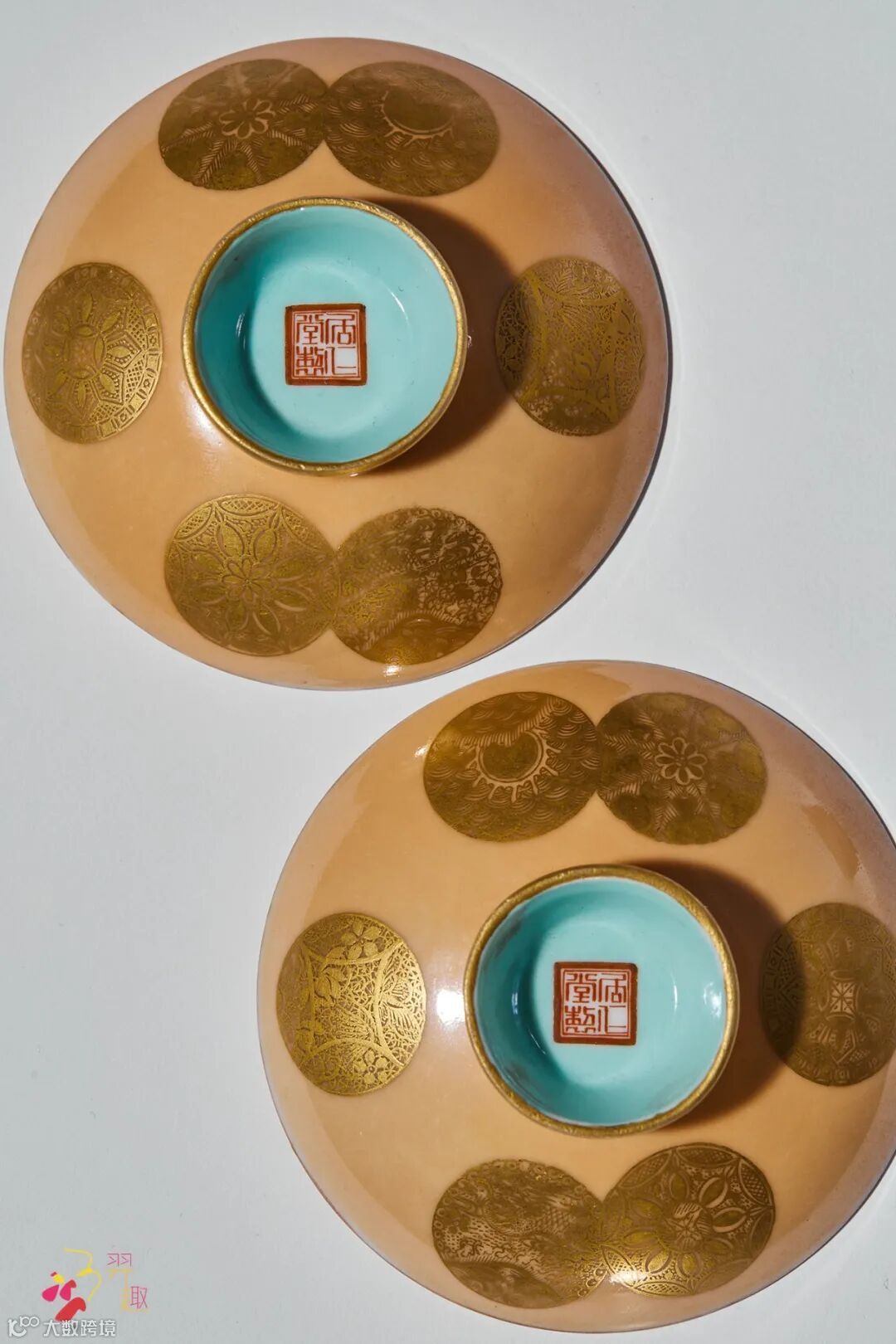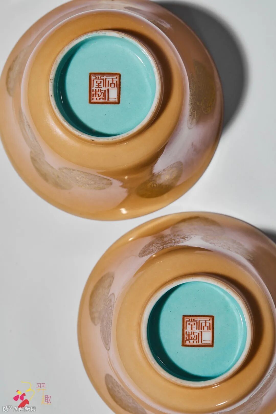 米黄地描金皮球花纹盖碗一对(底部图)