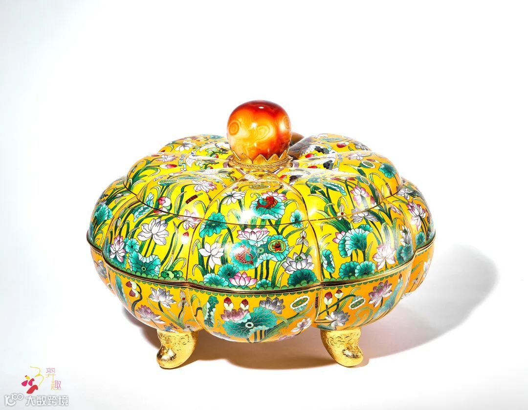 此作品是专为西哈努克国王和王后的卧室及客厅设计,景泰蓝与玉器结合之佳作。直径38公分,高约30公分,造型为八瓣瓜棱状。花纹为莲花有鱼,群仙祝寿。盒内中心为景泰蓝圆罐,周边有8个玉雕食盒相配,既可欣赏,又可实用。