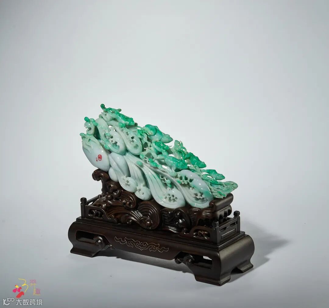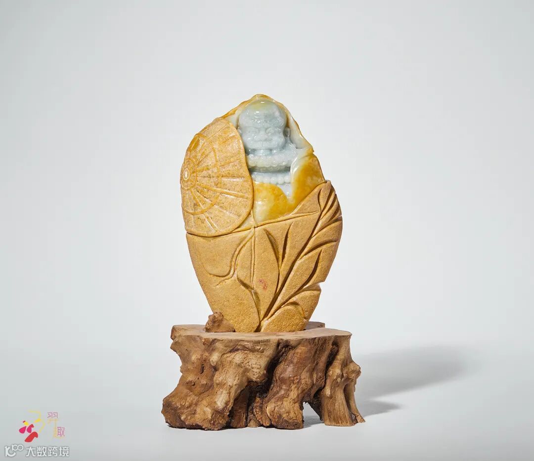达摩传说渡过长江时,并不是坐船,而是在江岸折了一根芦苇,立在苇上过江的。本件作品利用翡翠原石皮壳雕刻达摩祖师的草帽与芦苇。白肉雕刻气定神闲的达摩祖师。