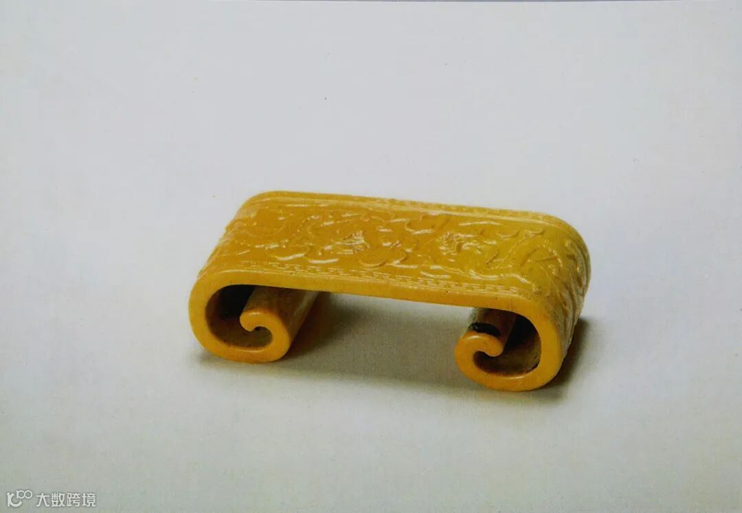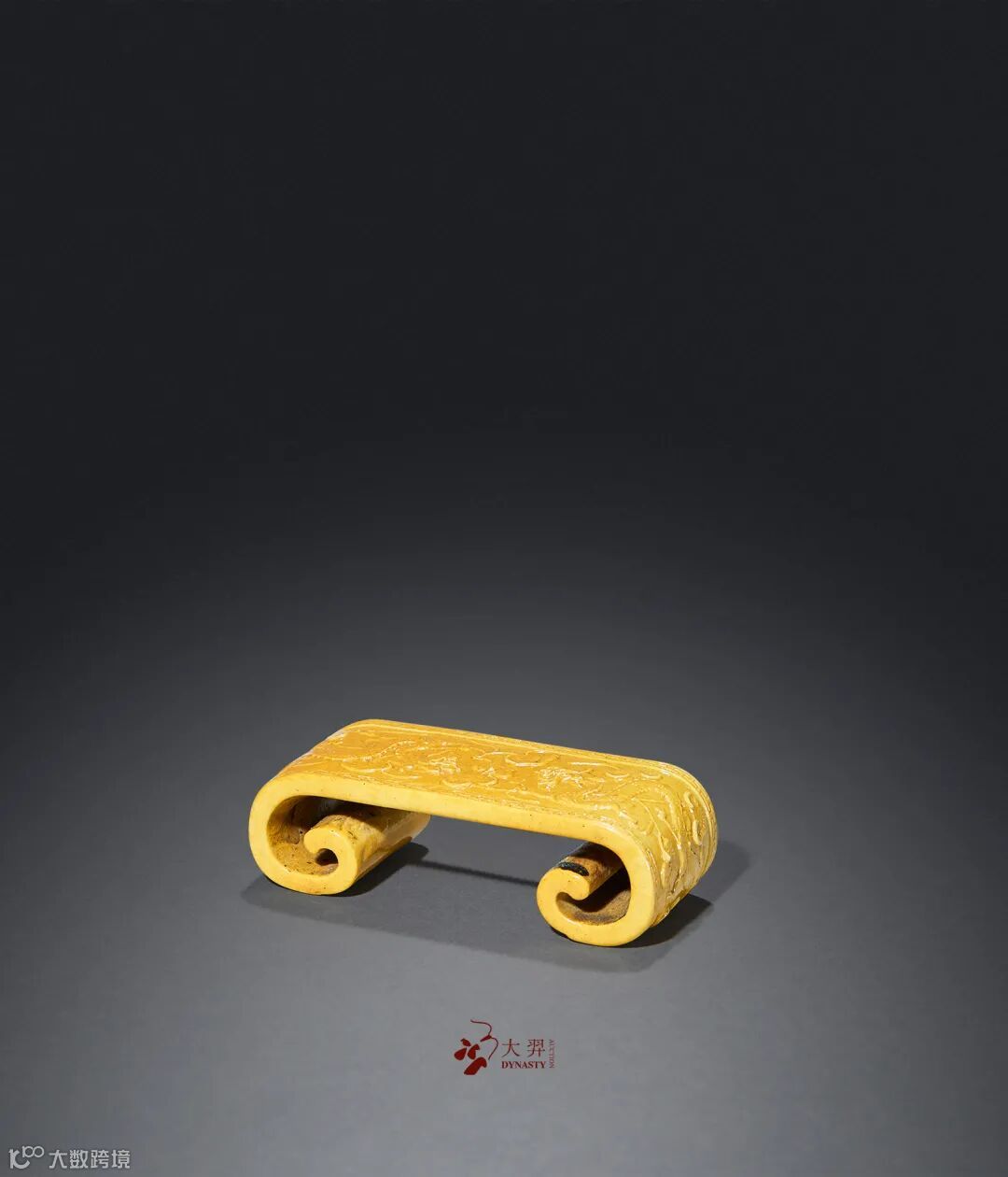 墨床造型呈书卷式,设计灵巧,全器遍施黄釉,床面模印灵芝纹,兼具实用及赏玩价值。拍品虽为文房小器,却有大样,古朴而精雅,颇具文人意趣。