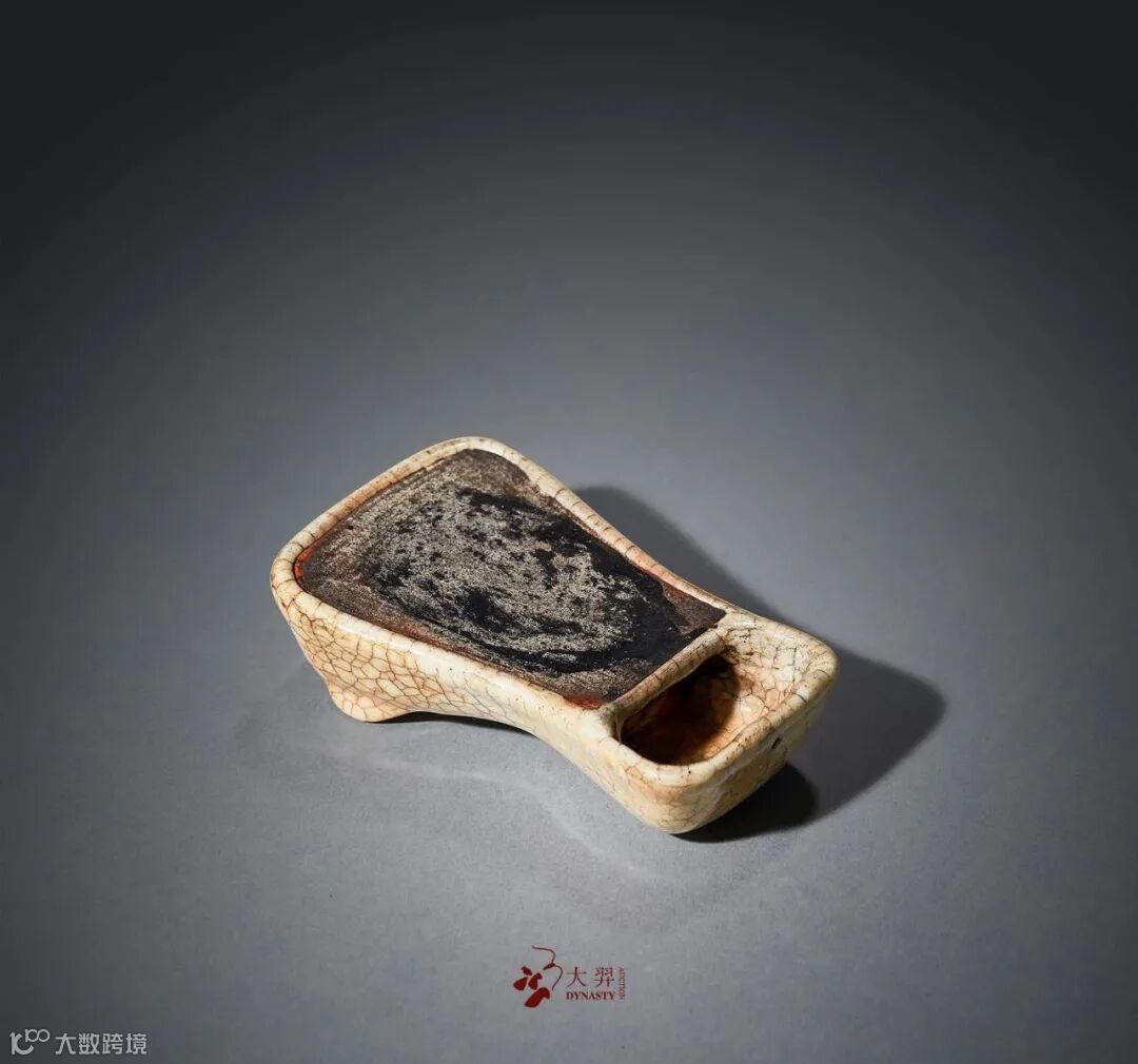 本品仿哥釉,金丝铁线,开片优美,器形小巧可爱,砚堂露胎无釉,形制古雅可人,适宜出行携带。胎质细实缜密,砚堂以外皆施仿哥釉,反映了文人追慕赵宋古器风雅韵味的独特情怀。釉色莹润雅朴,其上满布金丝铁线,大小开片错落有致。整器造型设计新颖,线条圆润自然,是为一件颇有意趣的文房佳作。