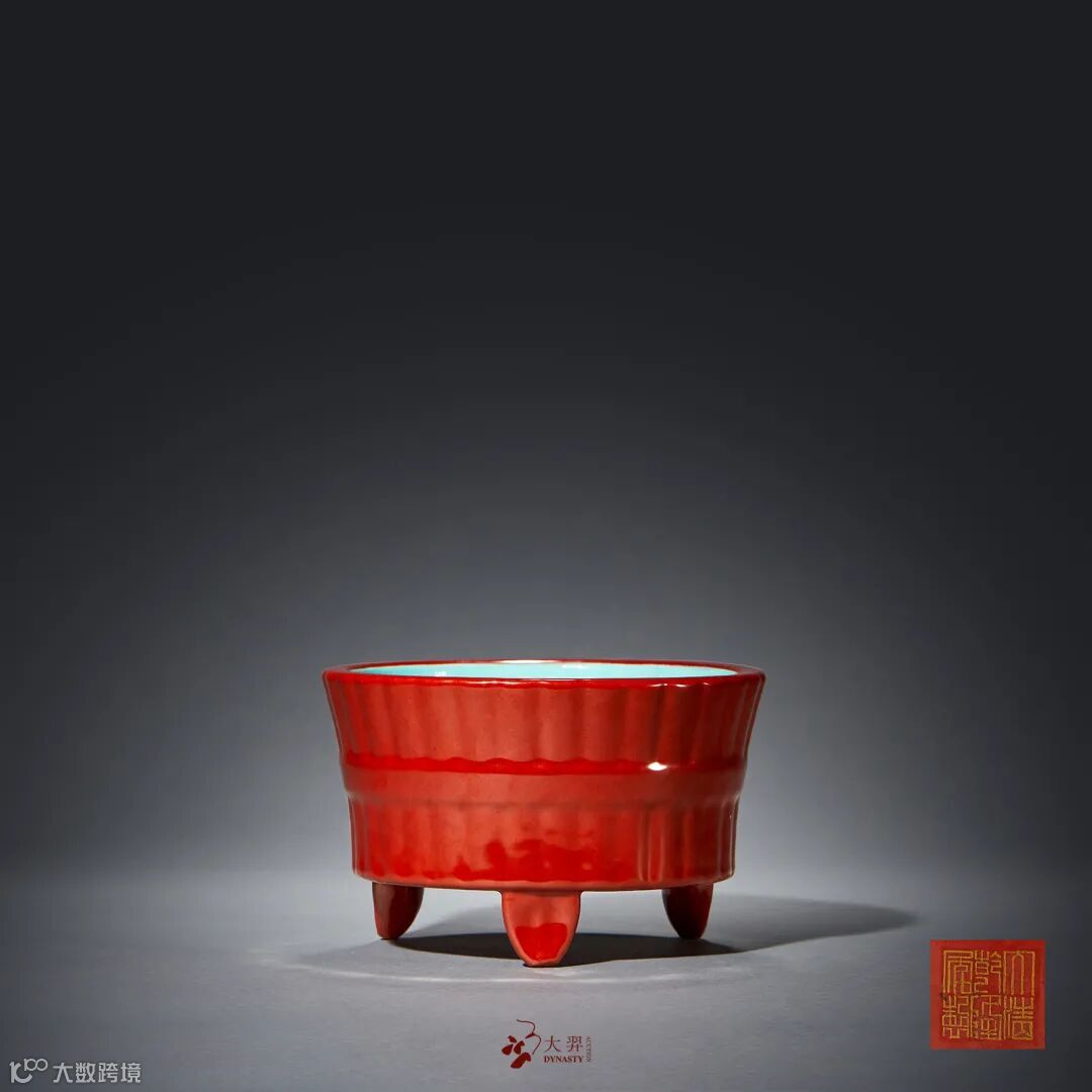 拍品直口,直腹,器身模印作束竹形,造型沉稳敦实,下承三足。器身内壁施松石绿釉,外壁施珊瑚红釉,釉色匀称润泽,沉郁细腻,光泽感强,内敛含蓄,沉稳大方之中又不失典雅隽秀,透出一份古典之美。珊瑚红釉为清康熙时期新创的低温彩釉,以吹釉法施彩,其色美如珊瑚,成为后世名贵装饰手法。