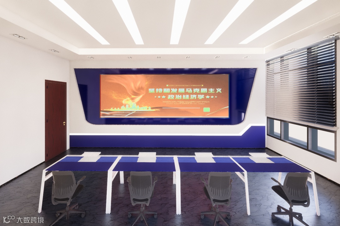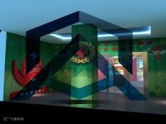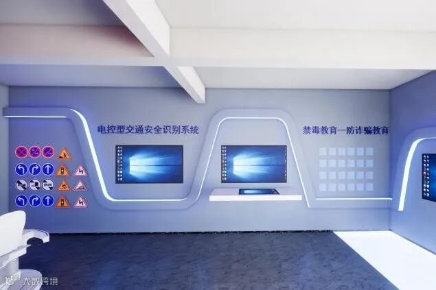 空间采用蓝色调的烤漆玻璃突出线条的魅力,墙面、顶面、地面各种手段形成交错相连的线条,用线条的交错连接阐释法制治理理念。设计了运输监控系统微缩示意模型,结合墙面视屏将监管跟踪信息经行传达。物联网模拟场景通过智能场景,将各种与智能控制系统结合在场景内展示。