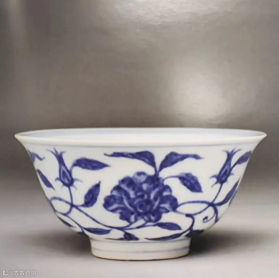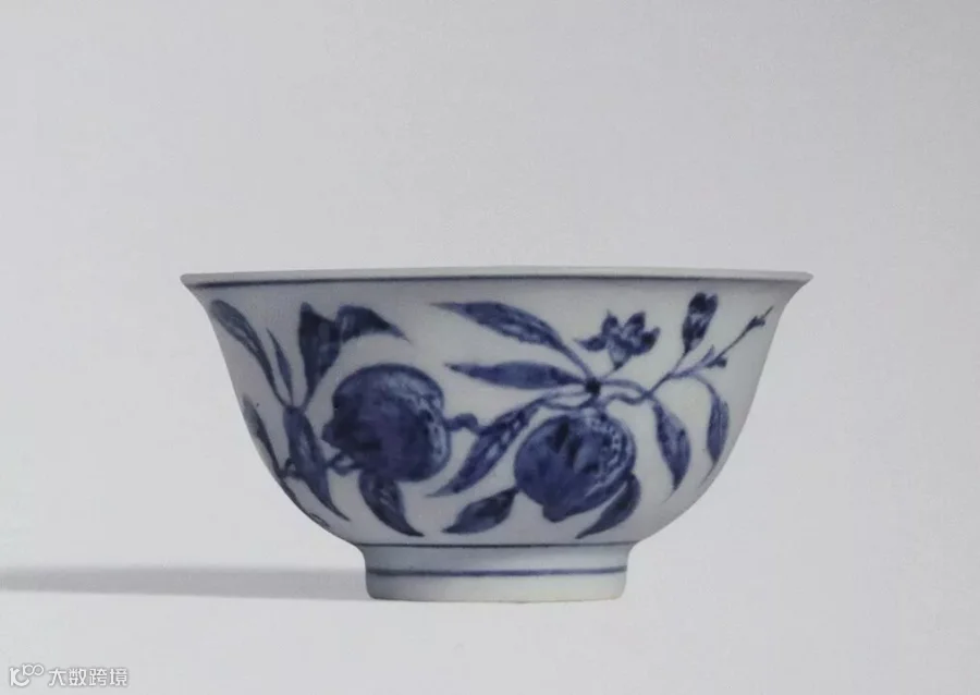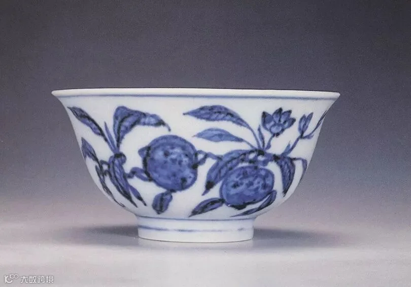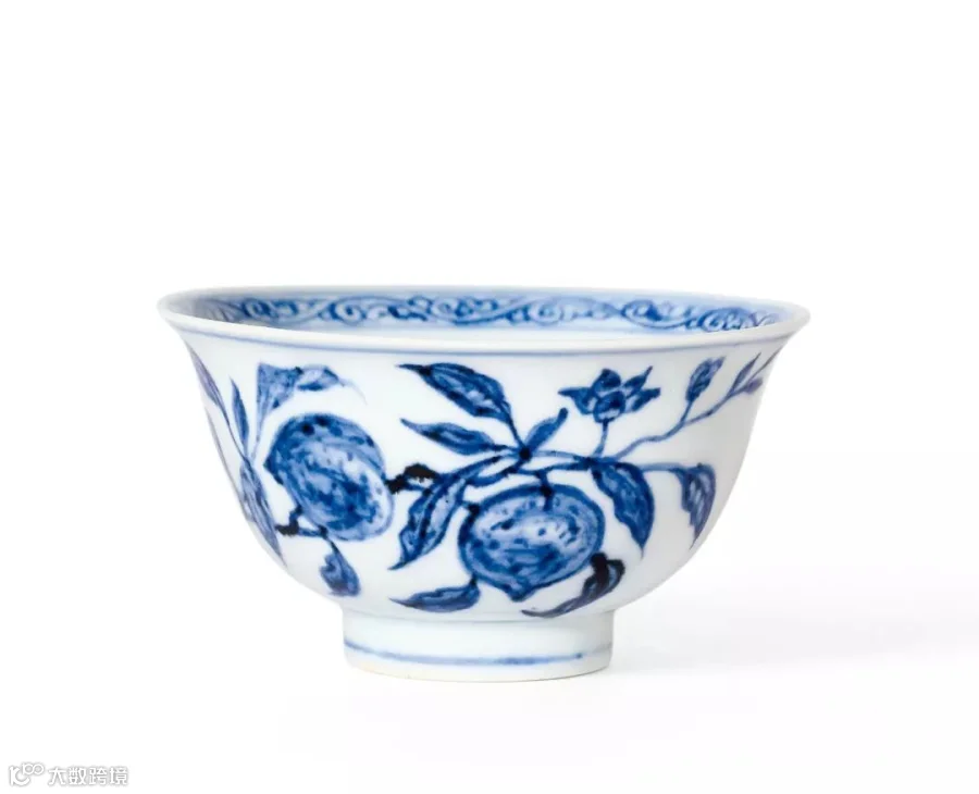 明永乐朝历时二十余年,是明代国力最强盛的时期。随着景德镇瓷器业的昌盛繁荣和技术的不断进步,永乐青花以其精细的胎釉,青色的浓艳,造型多样和纹饰优美而冠绝当世,与宣德青花瓷器共同开创了中国青花瓷的黄金时代。其纹饰疏朗秀丽、笔意自然。圆器内外加花,并广泛采用器心绘画的装饰手法。造型一反元代的厚重、雄健,趋于清新、流丽、端庄,器物上构图形式多样,丰富多彩,均给人以清秀之感,具有鲜明的时代特征。一般无款识,只有极少数有年款。永乐时期青花器物书写年款的虽然少,却开启了明清两代官窑器物书写朝代年款的先河。此杯器型规整精致,胎质细腻纯净,烧制工艺精美,青花色泽鲜艳,清新隽秀,纹饰设计别具巧思,寓意吉祥美好,绘工雅致,从青花发色、晕散现象、纹饰构图、器形、胎釉以及无款识的特点来看,均符合永乐时期青花瓷之特点,且由于此杯内模印、外青花的装饰手法更为少见,故此其为难得的永乐官窑精品瓷器,代表着永乐御窑于瓷艺方面登峰造极的成就。