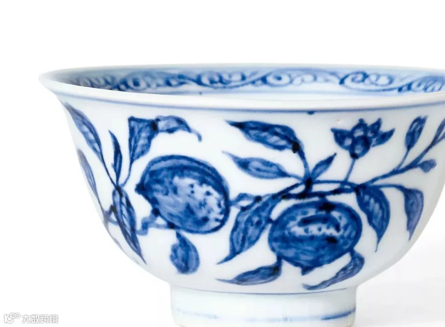 拍品口微外撇,弧腹较深,圈足。通体施白釉,青花绘画装饰。内口沿一圈缠枝卷草纹,碗心双弦纹圈内绘折枝花,花形似灵芝;外口沿绘青花单线圈,壁绘折枝桃纹,硕大饱满的桃实压坠枝头,桃乃贺寿佳品,寓意长寿祥瑞,不禁使人想起『南山仙桃大如牛,一食能益千年寿』的佳句。圈足仅饰一道弦纹,非常简洁。绘画笔法流畅,色调明快、蓝白相映,典雅秀丽,给人以赏心悦目的艺术享受。
