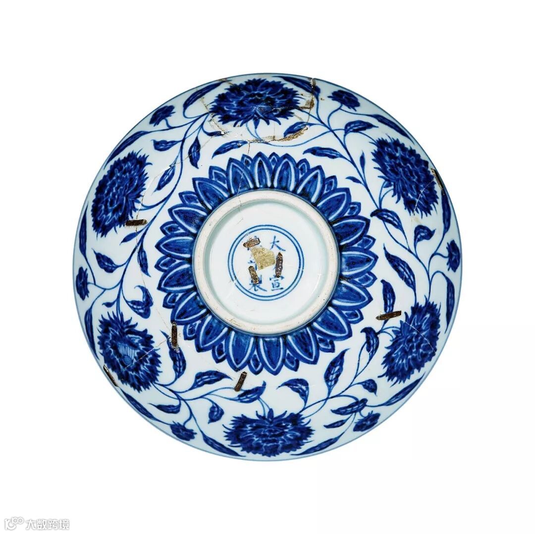 拍品敞口、宽口沿、浅弧腹、圈足。外壁以青花绘缠枝芍药纹,细小纹饰处采用一笔勾成的画法。腹壁共计六朵同花同向,花朵饱满圆润,花心状如葫芦,花瓣托苞。主枝为波浪形缠绕往复,小片花叶穿插其间,勾勒填色中有深浅变化。近足处为莲瓣纹饰,足壁绘以单线条装饰,内壁素白,碗心绘双圈朵花纹。青花发色浓深,底足平削,底款双圈六字“大明宣德年製”六字双行楷书款。此碗为明代青花名品,传世甚少,至为名贵,传世作品多见博物馆藏,市场流通极少;其造型、尺寸及纹样皆与两岸故,藏品一致。