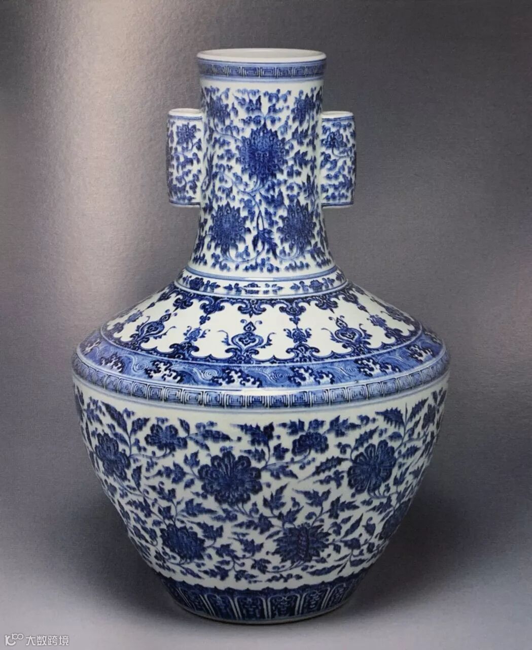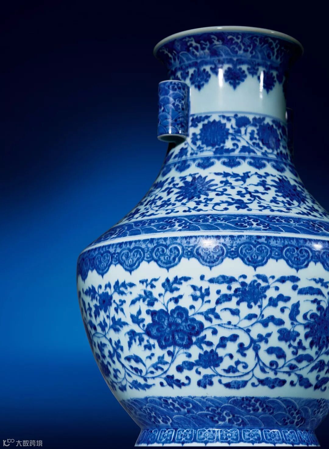 此尊撇口,束颈,折肩,斜腹,圈足,颈部左右附饰贯耳。自上而下绘饰十重纹饰,主题纹饰是缠枝莲纹和海水浪涛纹,构图虽繁缛而层次清晰,画工细致精湛,点涂技法运用娴熟,青花亮丽隽美,且色泽有深浅之别,浓淡相宜,层次宛然,苍雅之气跃然眼前,堪称乾隆御瓷少见之重器。此尊纹饰极为清晰,发色湛蓝。其周正端庄,制作严谨,成型技术要求颇高,难度不逊于方器的制作,双耳、圈足、瓶身均需要印模成型后粘合方成。