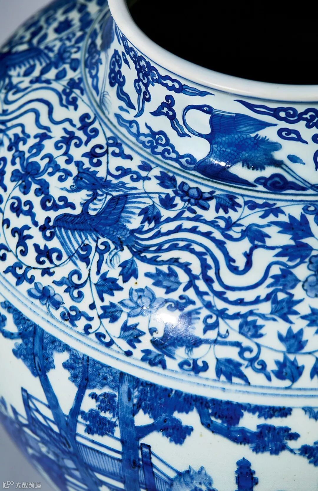 罐唇口,短颈,丰肩,弧腹,腹下渐收,近足处外撇。口沿饰云鹤纹一周,肩部饰凤穿花纹饰,中间主题绘十八学士图,青花纹饰通体绘制,发色明快,青料浓艳,画面运笔流畅。“十八学士”指唐代李世民为秦王时,于宫城西开文学馆,罗致西方文士,以杜如晦、房玄龄、陆德明等十八人,分为三番,每日六人值宿,讨论文献,商略古今,号为十八学士。