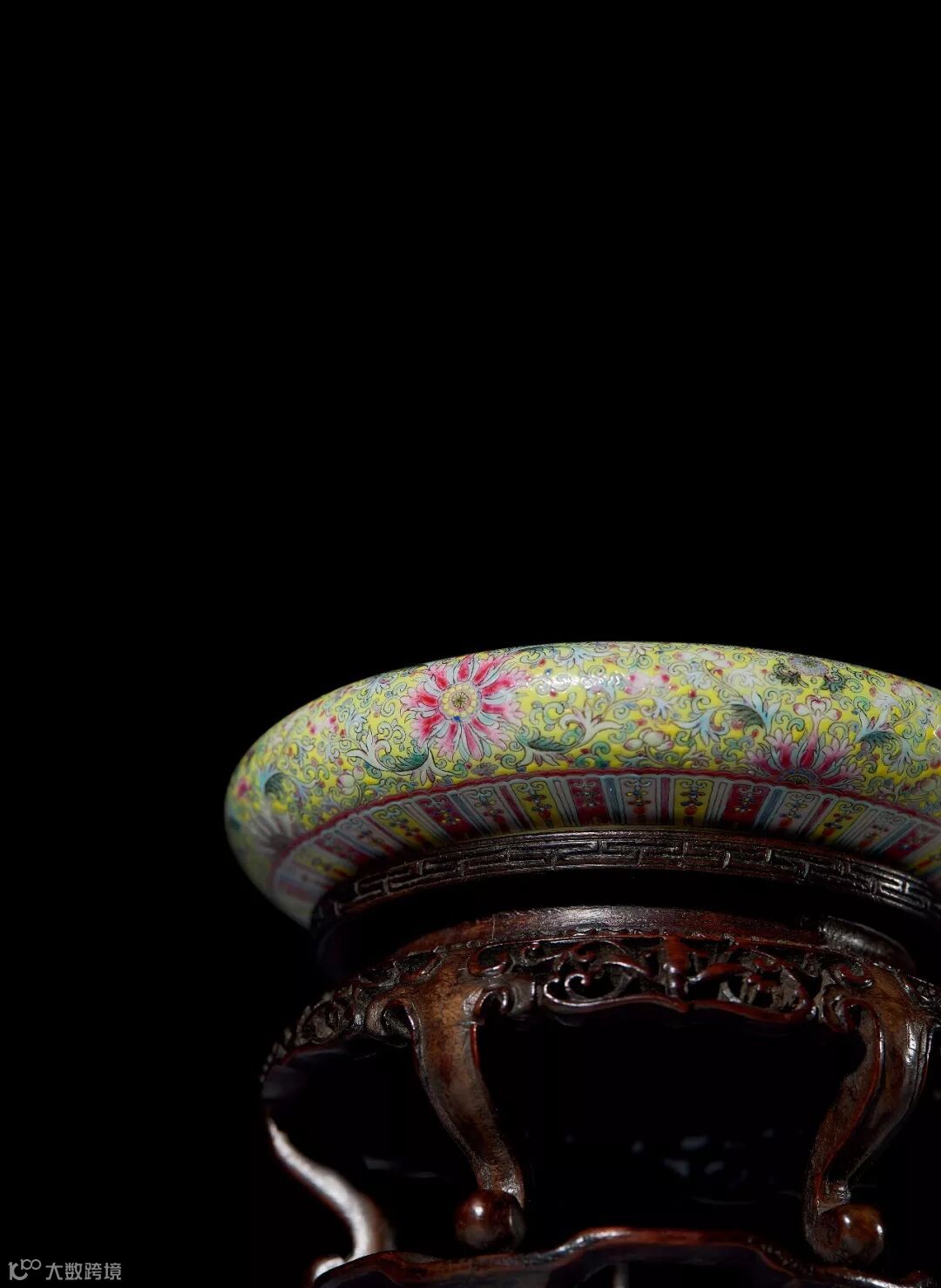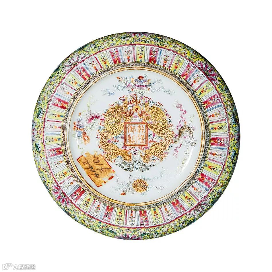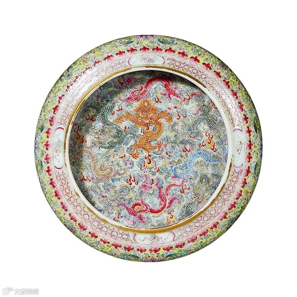 此水丞敛口,圆腹,圈足,造型稳重,缸口绘龟背锦纹。器身外壁施黄釉,以粉彩绘缠枝莲纹,近底足处绘变形莲瓣纹一周。水丞内绘粉彩九龙图,祥云迤逦,火焰飞滚,诸龙苍健凶猛,叱咤风云,气势凌厉恢宏其间,笔触灵动,其布局繁密而不乱,诸龙神态之描画精准,逼真传神。其中腾挪翻滚的九条龙,有“九龙在天,天下大治”之意。器外底粉彩描金作双龙戏珠,其间矾红书“乾隆御制”四字双行楷书款。
