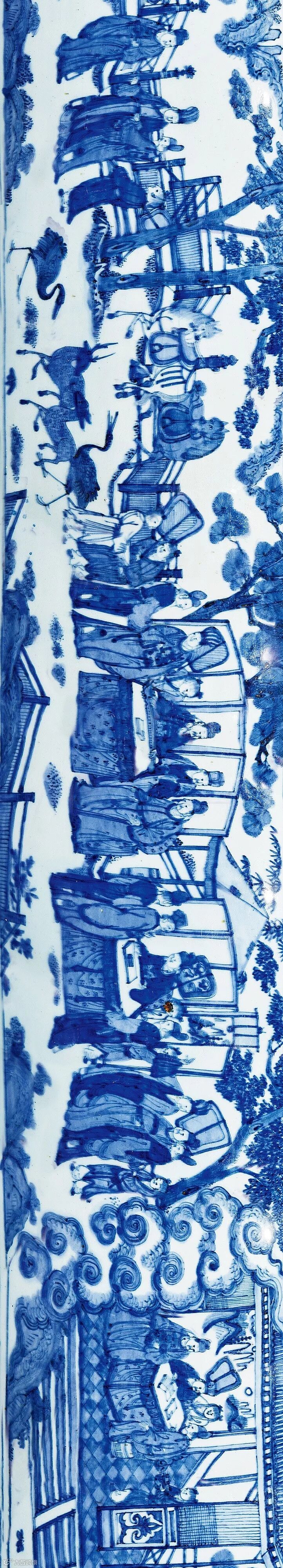 此罐造型标准,雄健稳重。十八位高士贤者集于一园之内,或对弈或抚琴,或论道于树下,均为神情悠然自得,气氛轻松惬意,园内遍植松柏,并搭配山石,楼阁若隐若现。远山近水、亭台楼阁、人物故事,整个画面布局错落有致,巧妙衬托了高士忘情山水超然物外的愉快心情,方寸间将人带入空灵邈远的山水化境之中。高墙深宅、楼阁亭台、曲桥回廊以及、男眷、女眷、孩童、宾客、侍从等众多人物。流传至今颇为难得。