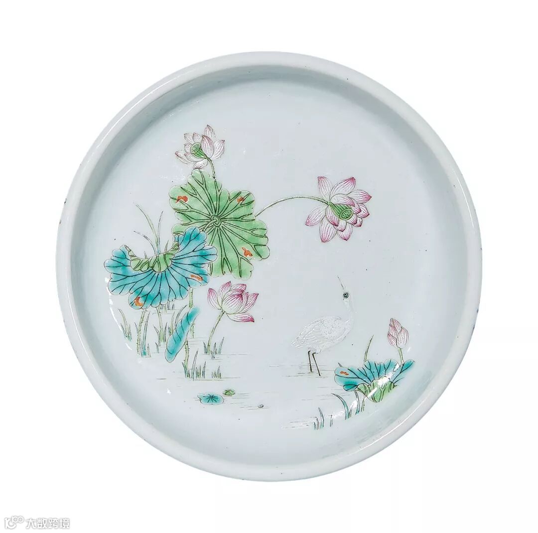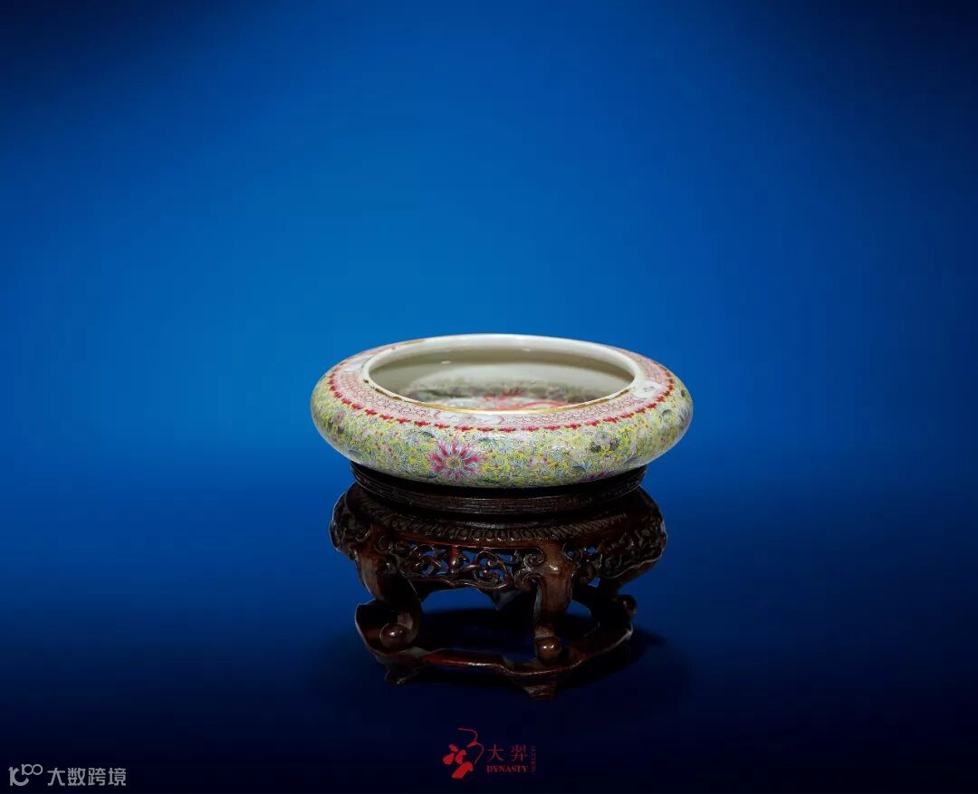 此洗口底直径相若,直壁,线条利落简约,造型大方端庄。体量均匀,胎质细腻坚实,釉面光润,温醇莹亮。洗内以粉彩绘荷花鹭鸶纹样,寓意“一路连科”。绘制技艺极为精湛,以填彩浓淡显示莲叶向背,生动写实,自然鲜活。构图疏密有致,层次清晰,格调高雅,极富意韵。外壁以粉彩绘缠枝宝相花,缠枝流畅,委婉柔美,花卉妍丽,设色明艳。