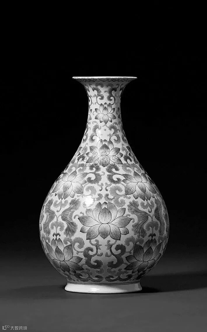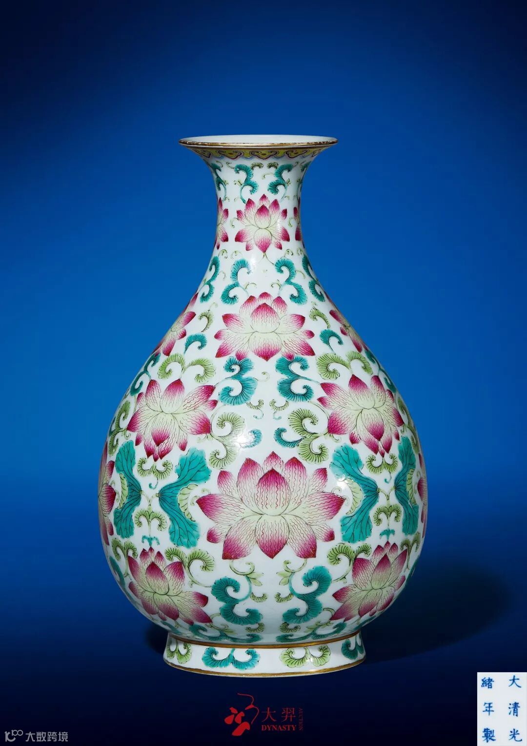 此瓶撇口,细颈,颈部中央微微收束,颈部向下作杏圆状下垂腹,圈足。线条优美,是为典型的晚晴时期玉壶春瓶造型,周正端庄,胎质细腻,釉面光洁莹润。外壁通体以粉彩满饰莲荷纹,构图繁而不乱,叶片翻转,枝干柔韧,荷花朵朵绽放。底部青花楷书“大清光绪年製”六字双行楷书款,款字清秀,颇具法度。