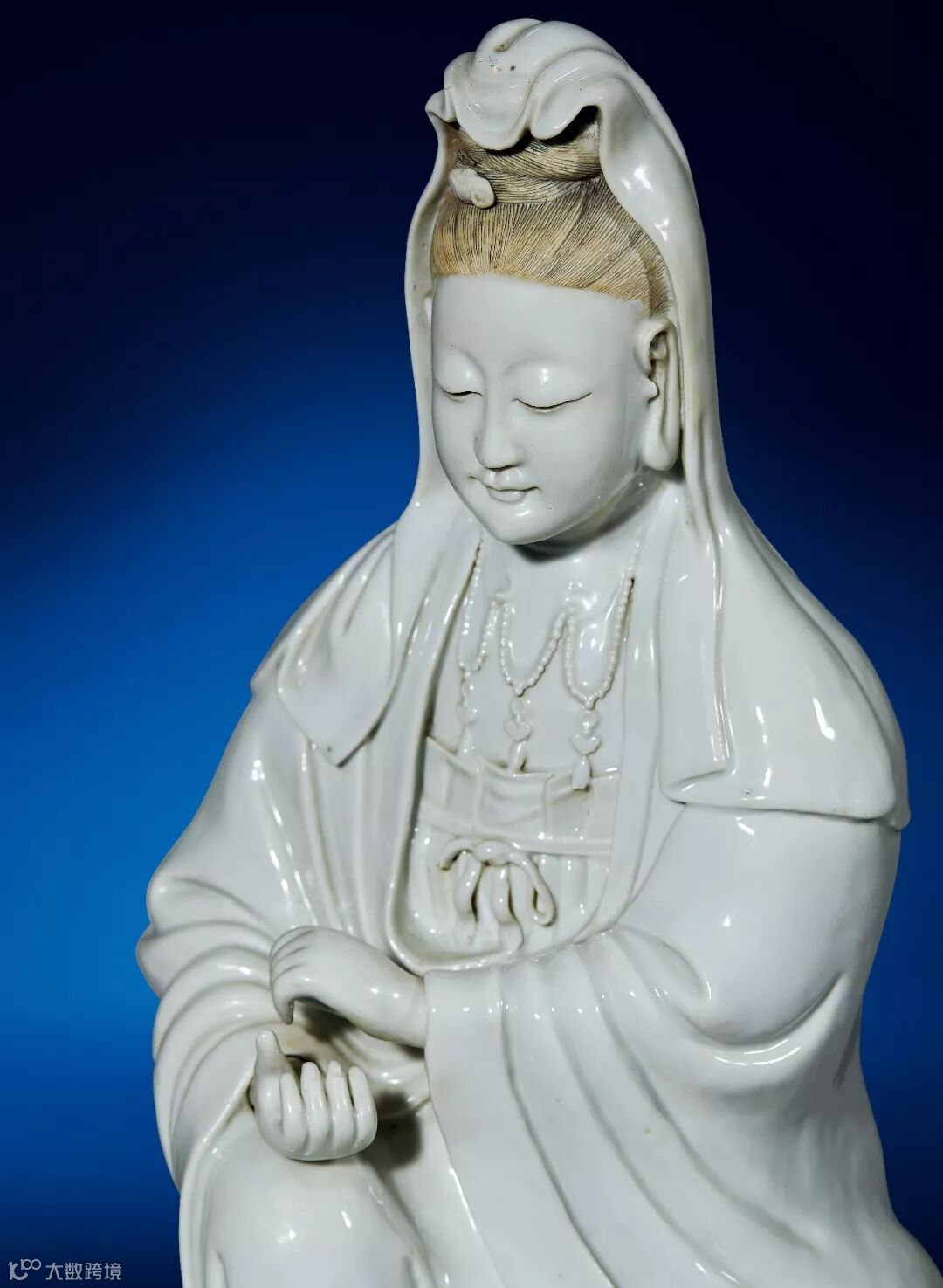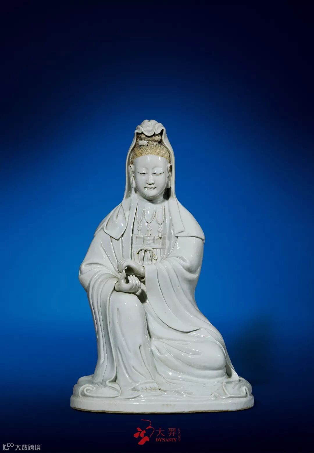 观音像罩施白釉,釉面匀润光泽,质如凝脂。面型饱满丰润,神态慈祥,胸前坠宝珠璎珞。头戴披风,发施墨釉。身着天衣,衣褶垂拂流转,半露赤足,呈游戏坐姿。观音法相、衣饰均与天津博物馆藏清乾隆唐英敬制款白釉观音相类,当为同时期景德镇御窑厂奉旨烧造,供奉宫廷之内的瓷质造像。