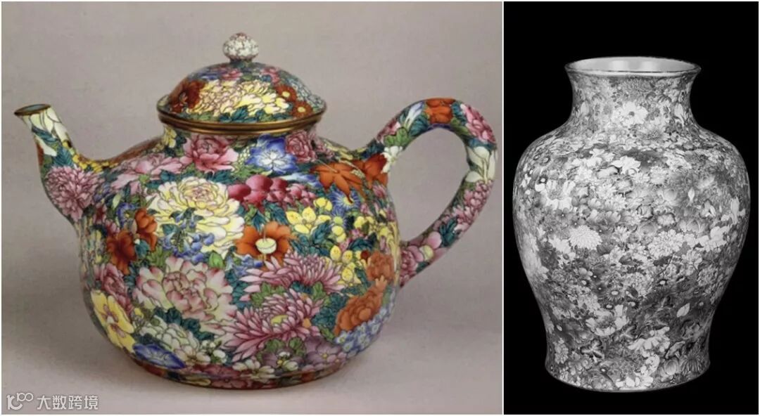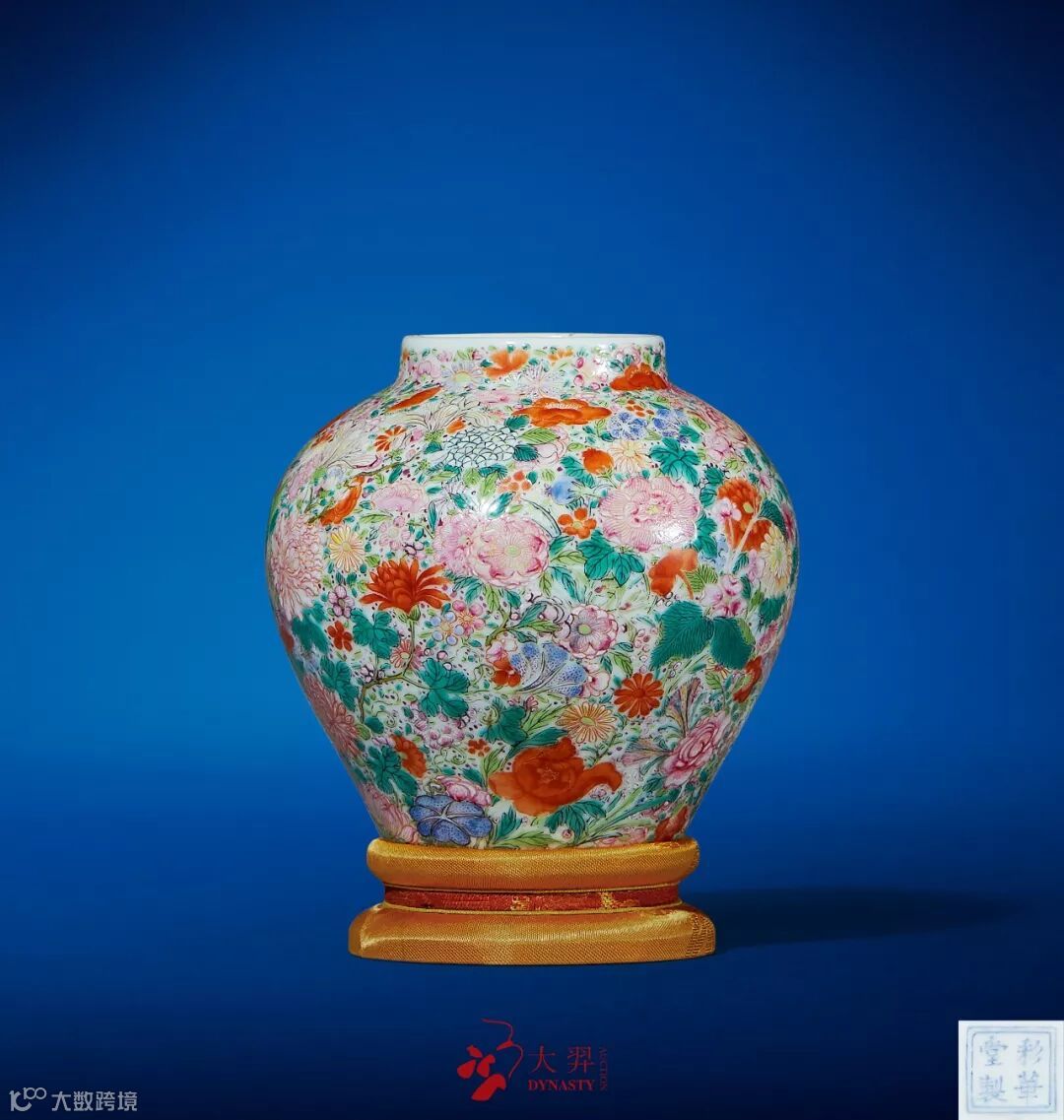 拍品为乾隆朝华丽之作,此类百花不露地为粉彩名品,清宫档案旧称为“洋彩万花献瑞”,始创於雍正时期,流行于乾隆朝。此罐堪称别致,尊贵秀雅,色彩艳丽而沉着,通体满绘各式花卉,上下相映,各尽其妍,种类之多,不胜分辨,使人仿佛置身百花丛中。该品种通常花饰遍身皆是,故临摹工作最难,而临摹画稿为施彩绘画之基础一旦有误则全局皆废,任其彩料何等研美,画手如何高超,亦无法弥补画稿原有之神韵。彩料配制之多堪称众瓷之首。一器之上所见颜色不下于三十余种,绘画之前,彩瓷的所有颜料必须配备,种类繁多几近百种,均需一一调试。故耗资甚巨,一气呵成绝非其它官窑可比。