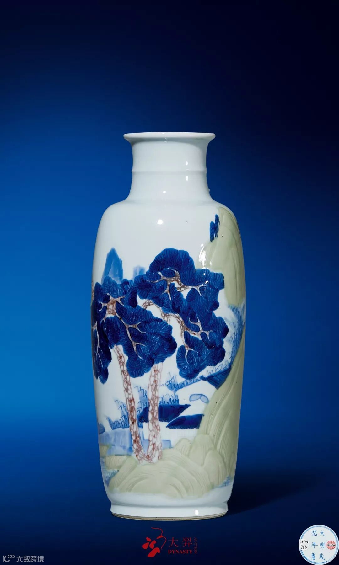拍品为一件难得的康熙釉下三彩精品之作。瓶身遍绘山石房屋、渔舟泛波,苍松古树,笔意简练高古,用色古雅沉静。