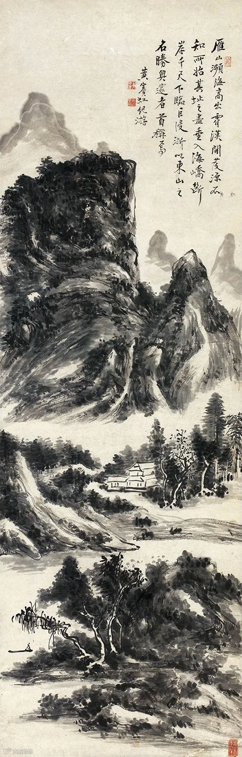 雁山濒海高出霄,汉间履源不知所。抬其址之尽重入,海峤 断岸千尺下。临巨浸浙以东山之名胜,奥邃者首称焉。黄宾 虹纪游。