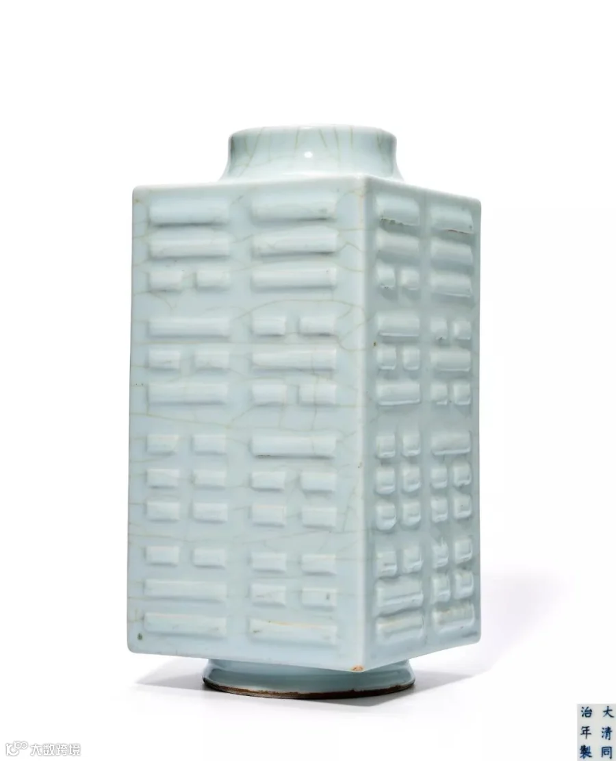 此器圆口,短颈,平折肩,四方体,圈足。形制凝重敦厚,胎体厚实,腹部四面突起八卦纹,通体施粉青釉,色泽凝润,釉质肥厚,自然高雅,底落“大清同治年制”六字双行楷书款。