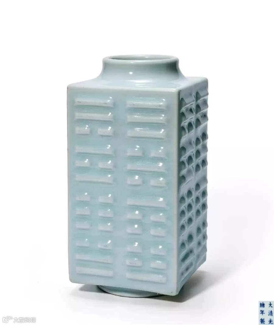 琮式瓶为清代官窑的经典器型,是从宋代起,仿照商、周玉琮加以变化而烧成的一种特殊器型。官、民窑均有烧制,清代乾隆朝以后成为官窑的传统器形,底圆体方,暗寓天圆地方之意。其外壁有素面和堆贴八卦纹两种装饰之区别,后一种亦称“四方八卦瓶”。此器为光绪时期制品,全器满施豆青釉,釉层凝厚纯净,色泽清新,自然古雅。整体风格端庄大方,古朴典雅。
