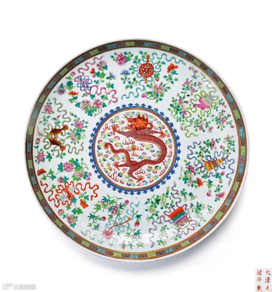 此盘体器硕大,敞口,浅腹,器形规整。盘心描绘立龙纹,内壁绘粉彩八宝纹,外壁绘粉彩花卉纹。粉彩八宝纹盘是晚清时期较为流行的品种,同治、光绪、宣统均有流传,但盘心纹饰如作立龙者则甚为罕见。由于粉彩不易保存,彩料多有磨损,而此盘彩料发色十分鲜艳。同时期光绪官窑盘,直径如此之大,并画工精细,寓意吉祥,保存完好者极少,非常难得,实为晚清官窑收藏之首选。