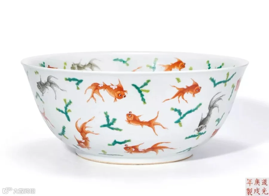 拍品体型硕大,敞口,深腹,圈足。通体以粉彩彩绘鱼藻纹,金鱼有全身朱红长尾披拂者,亦有灰白花金鱼,皆鳞片亮光闪烁。片片青萍鱼草似落花般点缀于水面之上随水波飘动,仿佛真实的池塘一隅,清灵而静谧。金鱼于水藻浮萍之间相对嬉戏,其景恰如:忽见轻条初出水,落花为雨过癹塘。逐队随群乐自如,桃花浪暖变形躯。