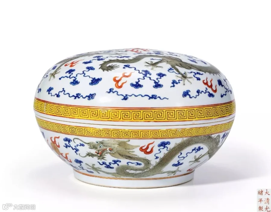 捧盒是一种专用于盛放食品的盒,口径大,器身高,因用时要双手捧起,故名“捧盒”。捧盒作柿形,由盖身两部分组成,阔口,弧壁,浅身。以白色高岭土旋胎烧制而成,胎质白皙,烧制坚致。盖面穹顶隆起,以墨彩精绘二龙戏珠纹,双龙体形矫健勇猛,盘旋飞腾,气势恢宏,火珠描金,旁有料彩绘如意云纹及矾红彩绘吉祥火云围绕,气氛热烈祥和。近例可参见纽约苏富比2014年3月18日第477号拍品曾拍过类似捧盒。