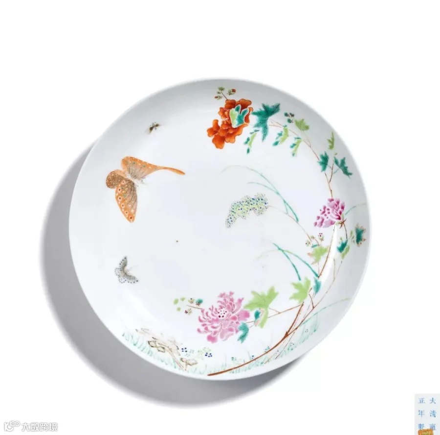 盘敞口,浅弧腹,底呈圈足,外壁光素无纹,盘内粉彩绘蝶恋花纹。盘心以掺入玻璃白的粉红、鹅黄和呈珊瑚红色的矾红绘制姿态各异的牡丹上三只蝴蝶闻香而来,于花丛间翩翩起舞,勾描的线条细若游丝,将彩蝶刻画得栩栩如生,显示出季节的喧嚣与生命的活力。釉彩浓淡相宜,施彩柔丽,构图疏雅简洁,纹饰具有纤细的柔态,用笔工细,为粉彩器物之精品。