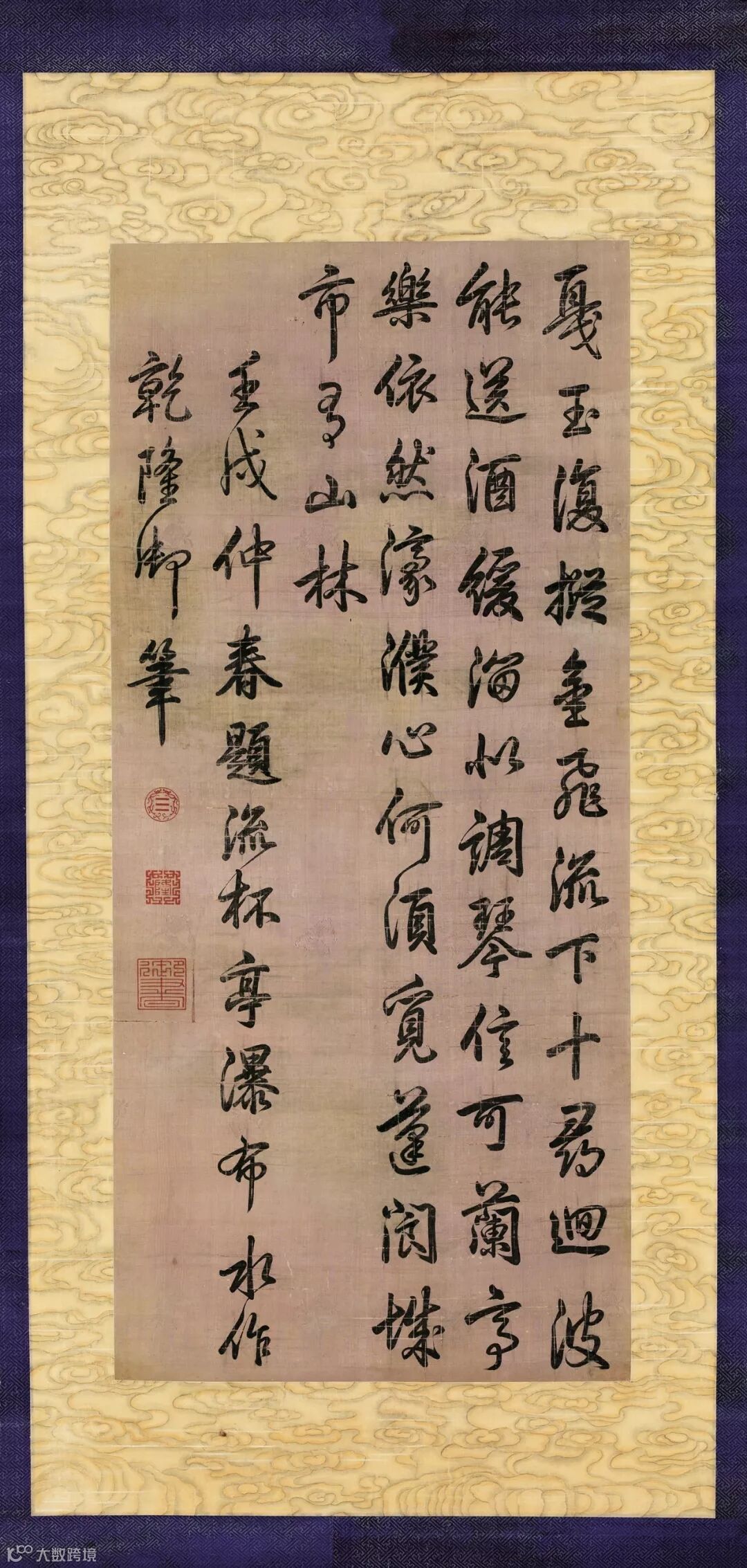 释文:戛玉复纵金,飞流下十寻。回波能送酒, 缓溜似调琴。信可兰亭乐,依然濠濮心。何须觅蓬阆,城市有山林。壬戌仲春题流杯亭瀑布水作乾隆御笔。