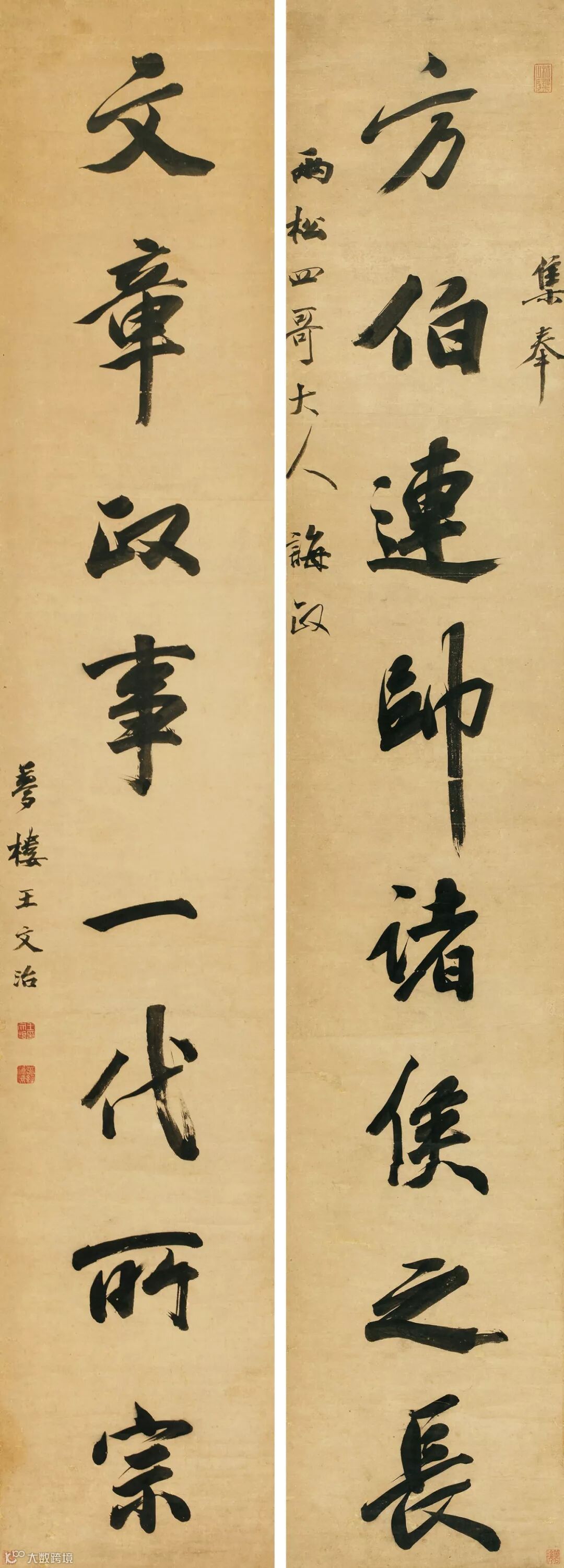 释文:方伯连帅诸侯之长,文章政事一代所宗。 集奉 眉亭大公祖年老大人清诲,旧治年愚弟王文治。