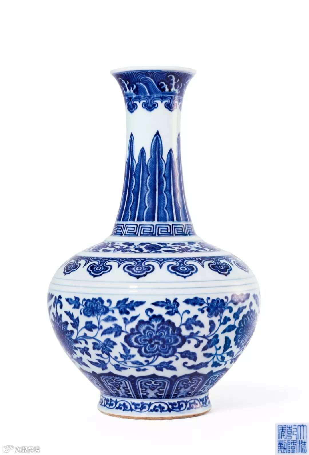 本瓶撇口长颈,鼓腹浑圆,圈足外撇,整器造型挺拔俊美。瓶胎釉白皙润泽,通体纹饰以青花绘,就其中口沿及颈部分饰海水波涛、如意云头、蕉叶、缠枝莲花及回纹共六条纹饰带,胫部及足际,则点缀仰莲及卷草纹,腹部主体满绘缠枝莲花,其花朵鲜活饱满,姿态各异,枝叶恣情生长,茂盛繁密。整器青花发色鲜艳明快,浓淡相宜,纹饰繁缛细密,层次分明,画工点染细腻,笔力高超。瓶底心青花书『大清乾隆年制』六字三行篆书款。