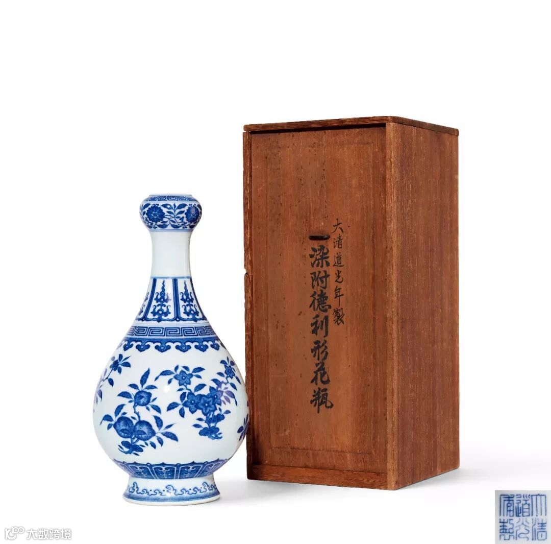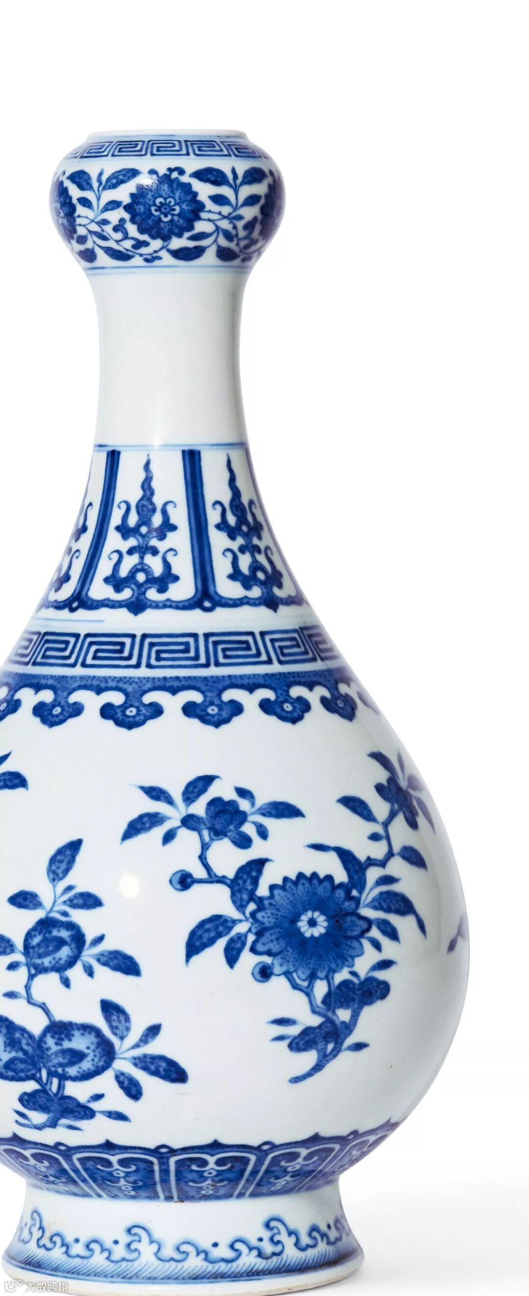 拍品蒜头形口,长颈微束,溜肩鼓腹,高圈足略外撇,底心青花书『大清道光年制』六字三行篆书款。造型挺拔俊美,胎质细腻坚实,釉面平整温润。瓶通体以青花描绘,口肩分饰回纹、缠枝花卉、莲瓣及如意云头等五条纹饰带。腹部主体以四时各式瑞果花卉为主题纹饰,绘制石榴、寿桃、牡丹、菊花、柿子等六枚折枝花果,分列两层布排,寓意多子富贵,连年福寿。每枝花果根部均点缀以灵芝,愈显灵枝仙果,祥瑞天赐。枝叶繁茂,舒卷优美,花果饱满圆润,秀丽动人,足胫部则以莲瓣及海水江牙为边饰,呼应颈肩花纹。全器装饰设计疏朗大方,青花呈色典雅鲜艳,为道光朝御窑厂的佳作。