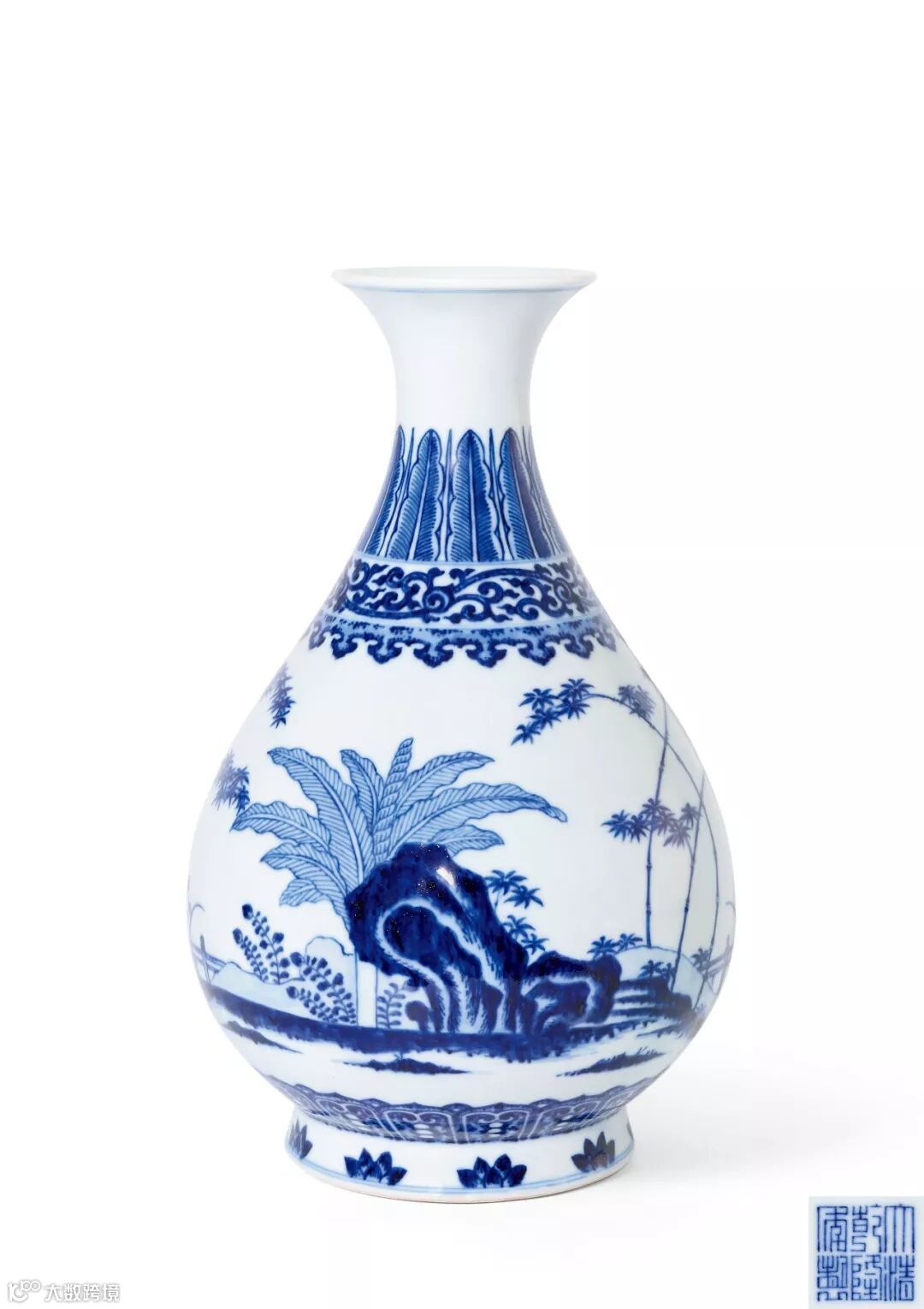 绘庭院小景题材之青花器,始见于元,绘栏栅、洞石,配修竹、芭蕉等,清丽风雅,别开生面。竹石芭蕉图玉壶春瓶始烧于洪武朝,永乐继之,此题材后为清代承袭,为宫廷传统陈设用器,尤以乾隆时期制品最为精丽。