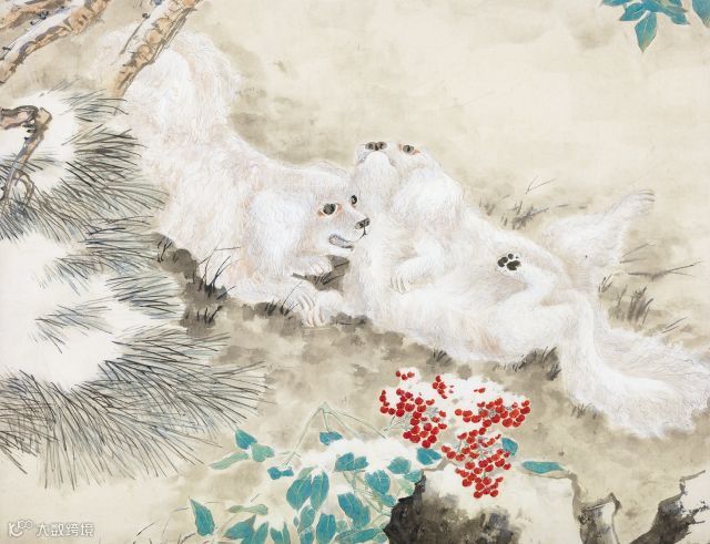 此帧便是画家以周之冕画意创作的一幅佳作。全画描绘的是寒冬时节,两只贵犬在雪地中嬉戏打闹,画家取名双欢图,寓意吉祥,画中景致都笼罩在一层厚厚的积雪之中。对于雪景的描绘,古已有之,但能在雪景中表达出一股寒意却并非仅是技术所能解决的问题,画家巧妙运用纸间的留白,计白当黑以表现茫茫的雪海,使人观之不禁生出身临其境之意,又配以红色果实与绿色叶片的衬托,则更显得雪景之中充满生机的感觉。