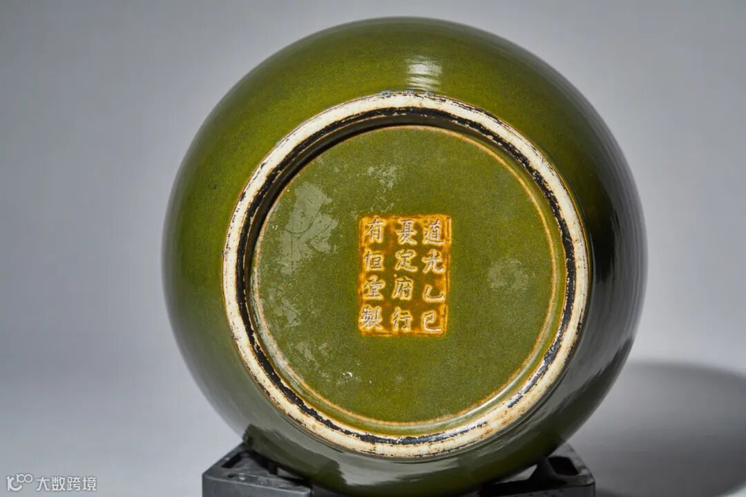 此尊体态饱满,唇口,短颈,丰肩鼓腹,隐圈足,底中心阴刻“道光乙巳夏定府行有恒堂制”十二字三行楷书款。尊通体满施茶叶末釉,釉面平整光润,质地细腻匀净,为道光时期单色釉精品。