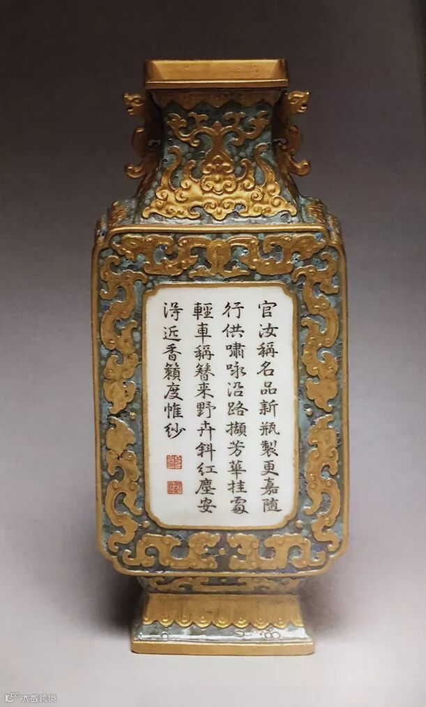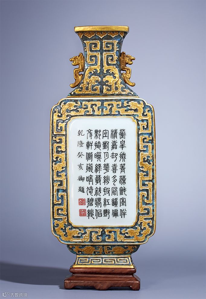 此件壁瓶外壁以古铜彩为地,营造锈蚀斑驳的质感,减地浮雕夔龙纹,纹饰描金彩。器身中央开光墨彩书乾隆御题诗文『蘅皋掇菁藻,毡室伴清嘉。却喜多风韵,偏宜对月华。纷披红艳伙,掩映绿丛斜。还似文轩侧,微吟倚碧纱』,末钤红彩『乾』、『隆』篆书印。器底书金彩『留余春山房制』六字篆书款。全器搭配和谐雅致,诗、书、印融为一体,相得益彰。
