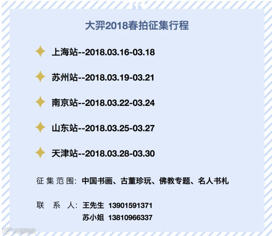 古有伯牙子期高山流水为知音,今有大羿跨越五城寻藏品! 2018年3月16日起,北京大羿春拍全面征集活动正式开始,大羿的专家团队将从魔都上海开始,经过苏州、南京、山东,最终到达天津,共计跨越五座城市,千里迢迢只为寻你! 北京大羿与您不见不散……