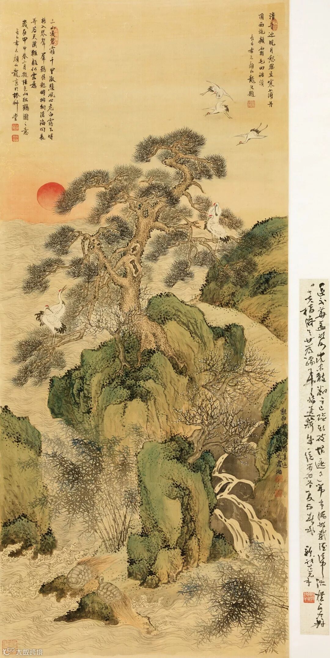 释文:1.三山凌若雾,千里激悲风。心危白露下,时转入琴声。群鹤俱起时,徘徊沧海回。长弄若天汉,轻躯似云悬。岁在甲申春二月,拟陆包山松鹤图之意,长白布衣颜伯龙写于椿草堂。2.清音迎晓月,愁思立寒蒲。丹顶西施颊,霜毛四皓须。长白布衣颜伯龙又题。