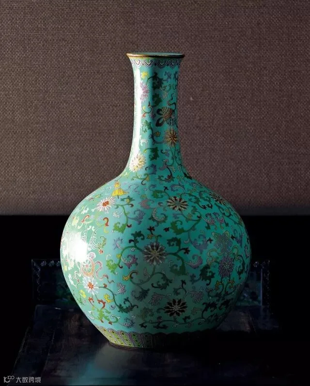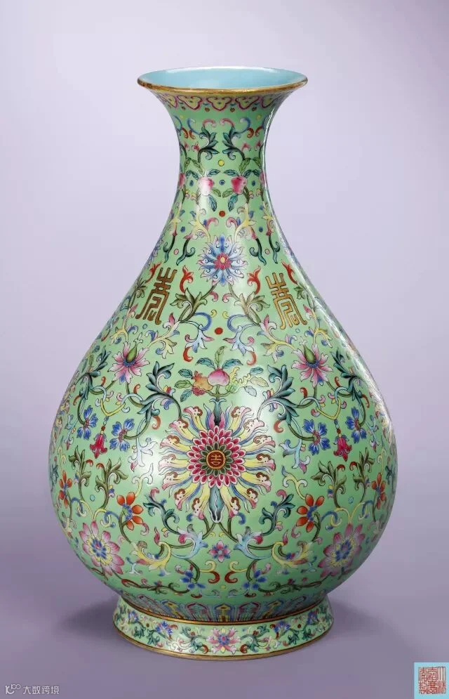 清嘉庆 松石绿地洋彩西番莲吉寿纹玉壶春瓶