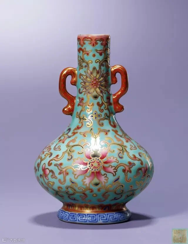清乾隆 松石绿地粉彩描金缠枝花纹双耳小瓶