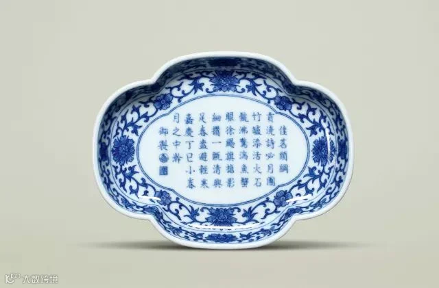 海棠式洗为饮茶用具,内外以青花缠枝莲纹装饰,中心为海棠形开光,开光外围饰一圈缠枝牡丹纹,开光内绘青花御题嘉庆帝的一首烹茶五言律诗整体绘画精细严谨,书写工整,生动地描绘出春夜皇帝品缆新茶之情景。