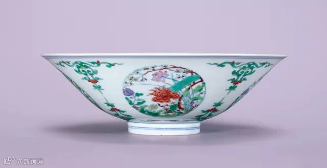 此碗以淡描青花勾勒轮廓,以不同色阶的绿彩为主色调,伴以红、黄、紫赭等色。碗心青花双圈内精绘团蝶,外壁绘四组团花,间饰俯仰勾莲纹,疏密有致。青花线纤细流畅,填彩精准,红色油润,绿色莹亮。最为特别的是,花卉多以胭脂色点染,衬托出纹饰的清雅柔丽,极为精彩新颖。御窑厂良工以其炉火纯青的技艺,将纹饰描绘得灵动逼真,色彩艳丽纷繁,为雍正官窑精品,传世少见,弥足珍贵。