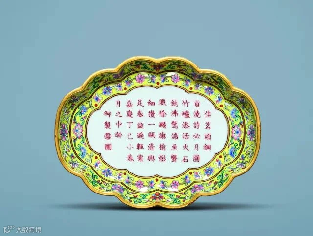 此盘形制呈海棠形,平底,下呈四条形足。口沿施一周金彩,胎制规匀秀美,釉质细腻白润。圈口、四足金彩,通体为黄地,盘体内外壁复绘勾莲纹,间以金彩相隔,盘心海棠形开光内绘红彩御题诗文:“佳茗头纲贡,浇诗必月圆。竹炉添活火,石铫沸惊湍。鱼蟹眼徐扬,旗枪影细攒。一瓯清兴足,春盎避轻寒。嘉庆丁巳小春月之中澣御制。”后有“嘉”“庆”印章款。这首壶铭茶诗,是嘉庆帝于嘉庆二年(1797)十月中旬所作。传世器物中,多见御制诗部分矾红、与口沿描金部分剥落较为严重,此件保持较为完好。