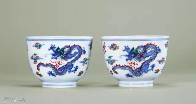 此对杯敞口,深腹,形制规整,极见别致。内外施白釉,外壁绘青花五彩云龙纹,两两首尾呼应,各有顾盼,怒目圆睁,须发怒张,龙体遒劲。釉面光洁滋润,足端漏胎处可见胎质细腻,胎体薄俏坚致,为雍正朝青花五彩官窑瓷器的精美之作。