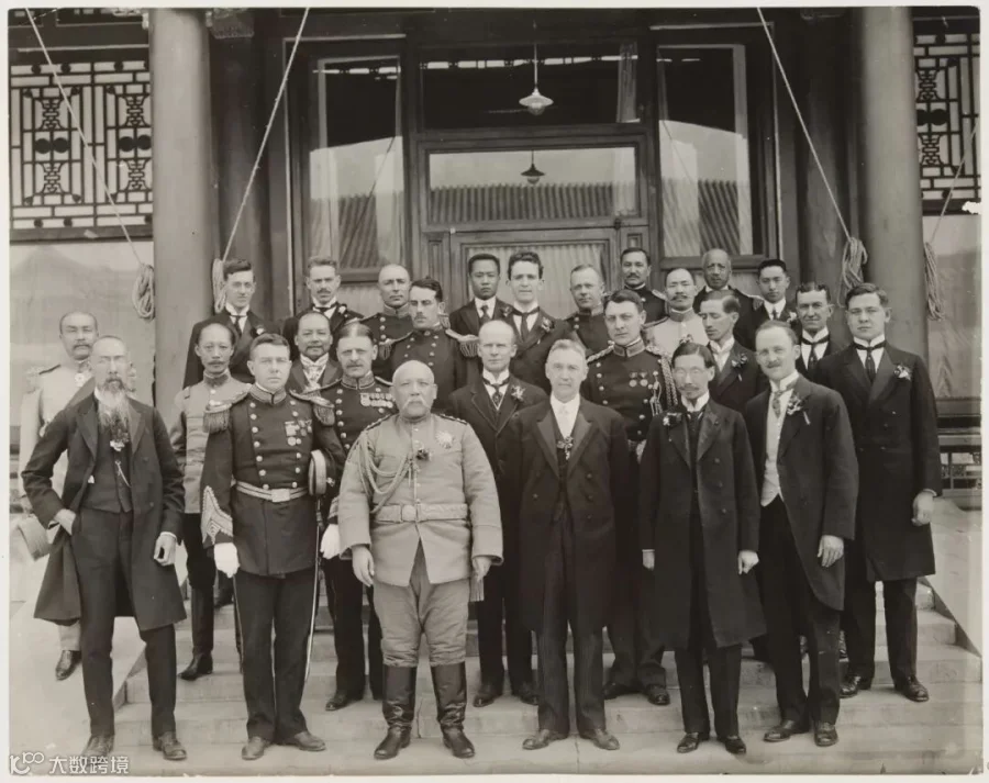 1913年10月10日袁世凯就任大总统,各国驻华使节觐见。三排右一即外交部参事顾维钧