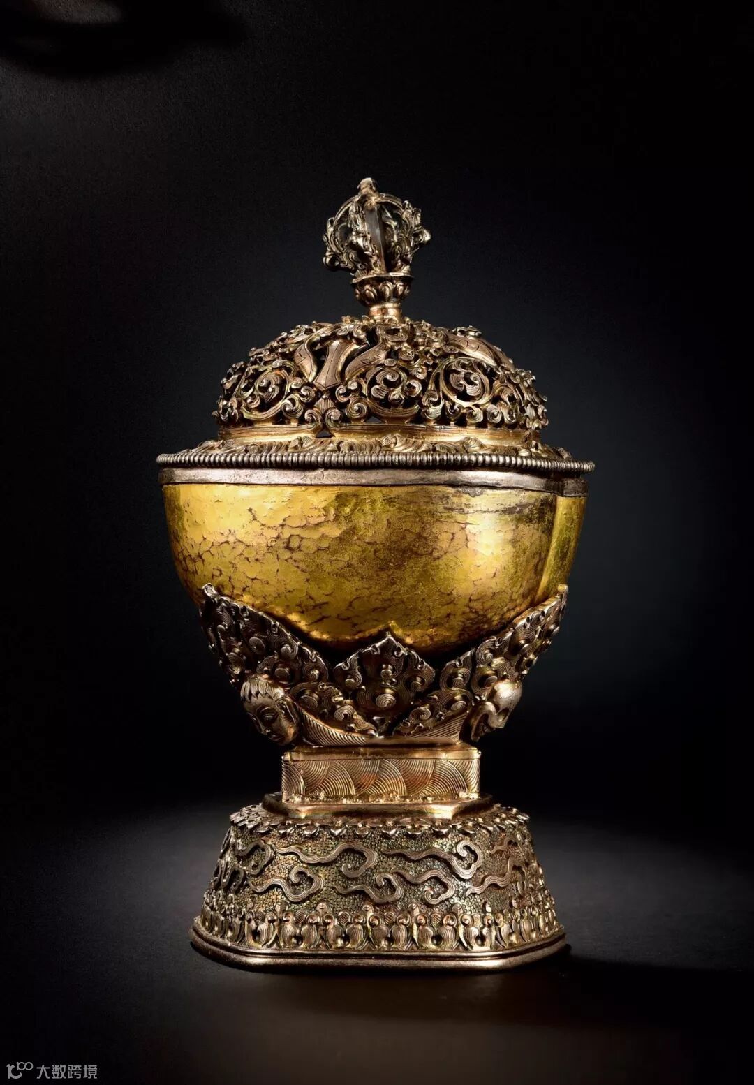 此套嘎巴拉供碗保存完整且皆为原配,难得一见,上有半镂空盖,下有三角形座。碗盖为白铜,顶端有一半支五股金刚杵,铸造精良,弧度优美,力道强劲,下承接莲台,双层莲瓣,饱满而富张力。碗盖装饰纹样繁复华丽,最上方为一枚镂空雕刻的十字金刚杵,四周为“肆意”缠绕、弯卷的缠枝纹,层次分明,让人无比赞叹这精湛的工艺,以及它极高的艺术价值;主体嘎巴拉碗,以利玛铜铸造,形似颅顶,铜质精纯,外部鎏金,极为罕见。底座造型亦较为繁复,上承托部分为三角形,三个角落上都绘有人首,这代表着象征战胜贪、瞋、痴三魔,尸首之间为弯卷的火焰纹,这样的装饰为这套法器增添了一丝柔美的气息。