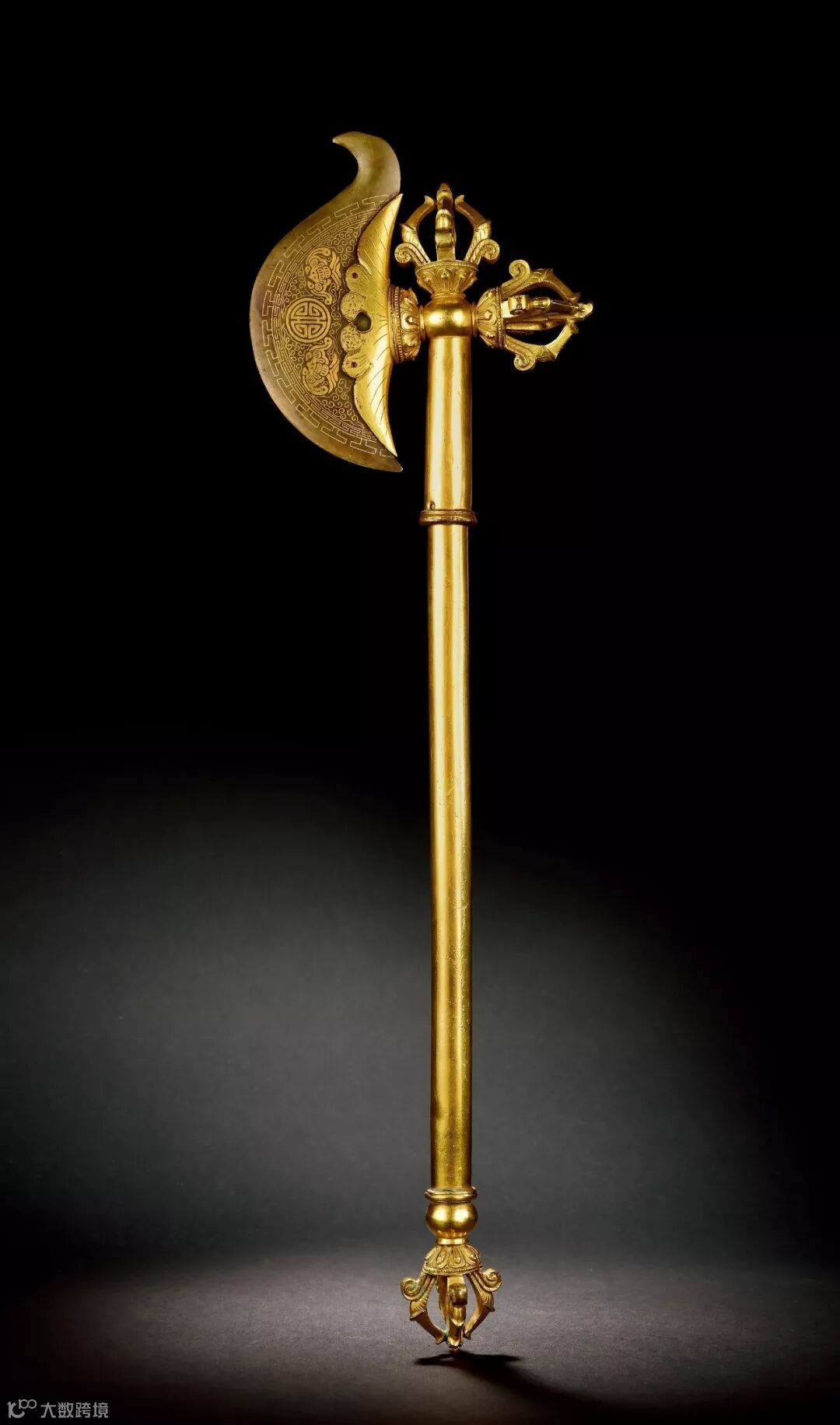 在佛教象征意义中,金刚斧象征着断灭心中一切谬见和谬念;它斩断生死,斩断根干。作为实物的金刚斧一般出现在大威德金刚等本尊的手中,单独出现极为罕见。这件金刚斧以利玛铜打造,铜鎏金制作斧身和斧柄,制作工艺复杂,造型精美,级别极高。