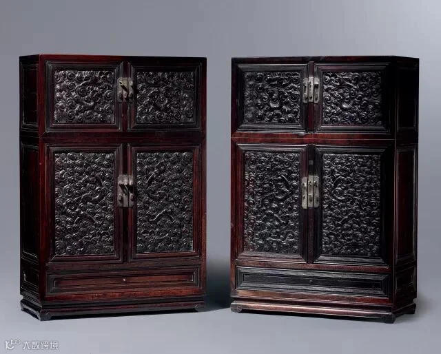 立櫃紫檀制,質地沈潤,成對而存,四角見方。為清式頂箱櫃傳統的上下分層結構,上層頂箱,下層立櫃,皆為對開雙門設計。櫃體的門心板上均高浮雕雲龍紋,獨角後揚,身形矯健威猛,周身雲氣繚繞,場面壯闊,似穿雲吐霧而來,攝人心魄。刀法深峻,雕工精細,鏟地尤見匠師之功力。邊框安銅鍍金合頁、面頁及鎖鼻。門下櫃膛做抽屜,美觀而實用。下承四雲頭矮足,小巧雅致。這種以龍紋為裝飾主題的家具多見於明清宮廷。據史料記載,紫檀龍櫃壹般都以壹對或兩對的形式,陳設在乾清宮、養心殿壹類的宮殿明間。本件器物尺寸較小,常見的陳設方式為,在炕案上陳設壹對立櫃,符合滿族人的生活習俗。故宮博物院有相似藏品,形制與此件相仿,除紫檀外,臺北故宮博物院亦收藏有雕漆等材質,可茲比較。